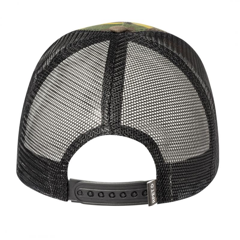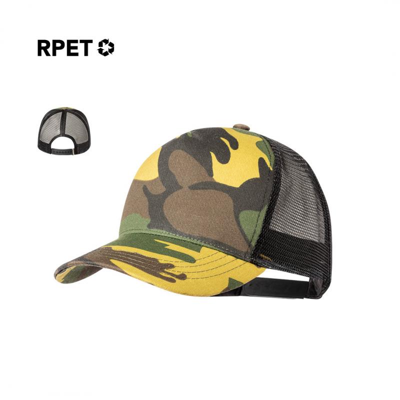 Gorra de 5 paneles en poliéster RPET con rejilla y cierre ajustable de plástico con diseño de camuflaje o verde militar. Etiqueta distintiva de RPET. El material RPET se elabora a partir de plástico reciclado, para así fomentar la reutilización de residuos plásticos y ayudar a la sostenibilidad del planeta.