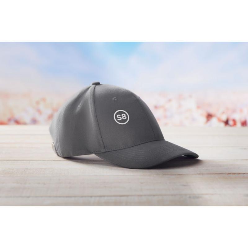 Gorra de béisbol de algodón peinado con 6 paneles con cierre ajustable con hebilla. 6 ojales cosidos en color a juego. Medida 7 1/4.