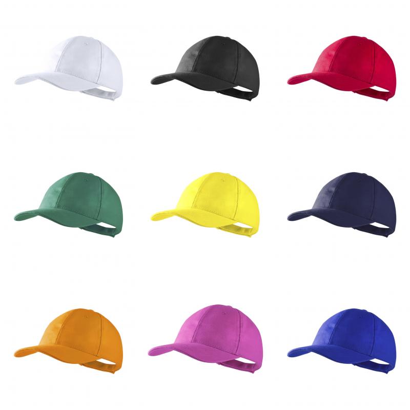 Gorra de 6 paneles en material 100% algodón peinado. En variada gama de vivos colores y con acolchado en visera. Orificios de ventilación bordados y cierre ajustable de velcro.