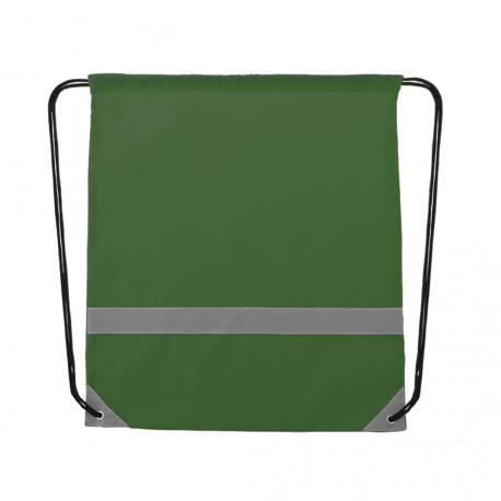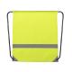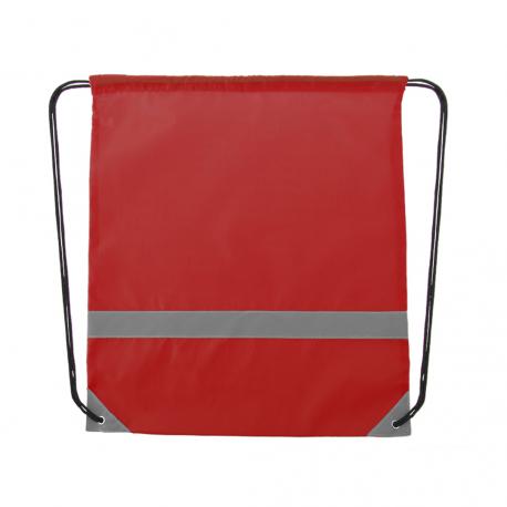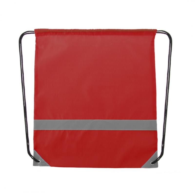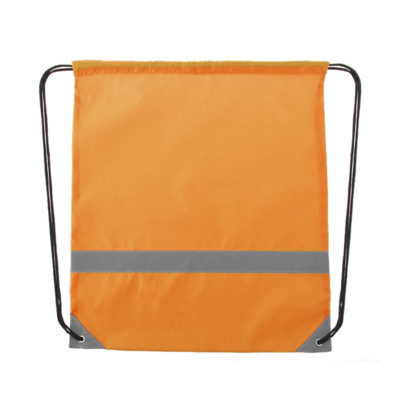 Mochila reflectante en suave poliéster 190T de alegres colores, con tira frontal reflectante. Cuerdas autocierre en color negro y esquinas reflectantes reforzadas con argollas metálicas.