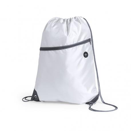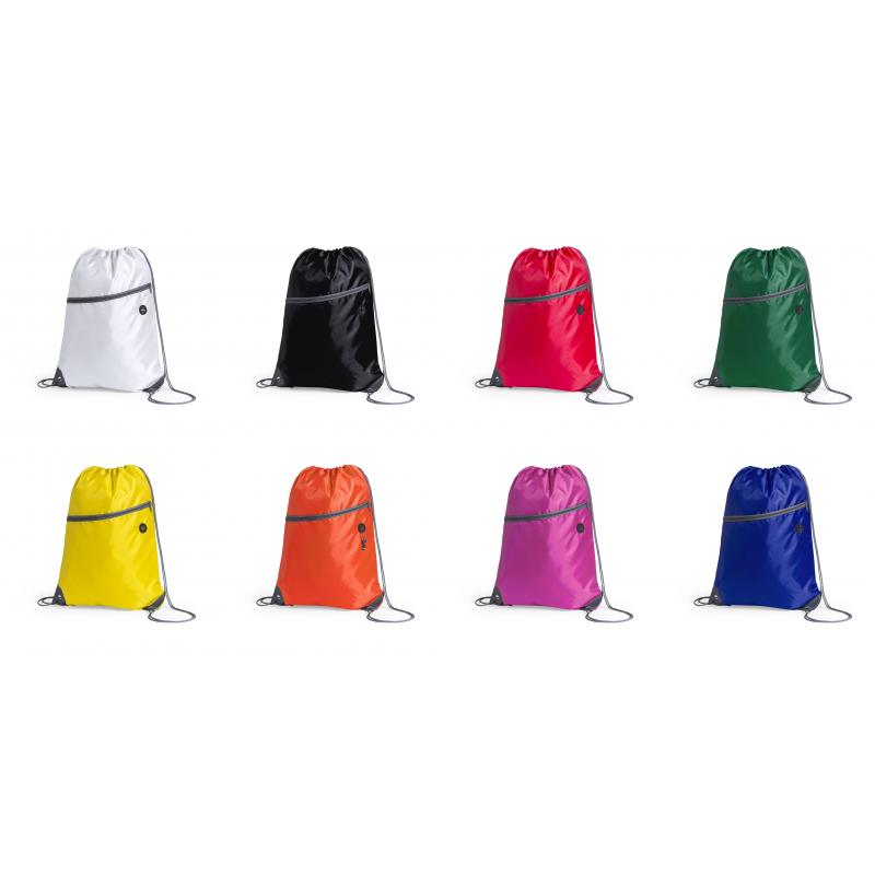 Mochila de cuerdas fabricada en suave poliéster 210D. Con bolsillo frontal de cremallera y salida de auriculares. Cuerdas de autocirre en color gris, a juego con cremallera y esquinas con argollas metálicas y refuerzo de polipiel. En variada gama de colores.