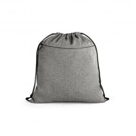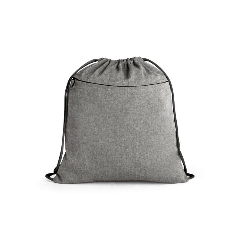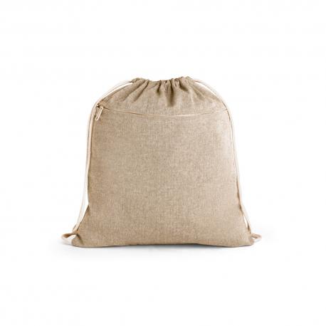 Bolso tipo mochila fabricado con algodón reciclado (140 g/m²). Incluye bolsillo frontal con cierre de cremallera y asas de cuerdas de algodón.370 x 410 mm