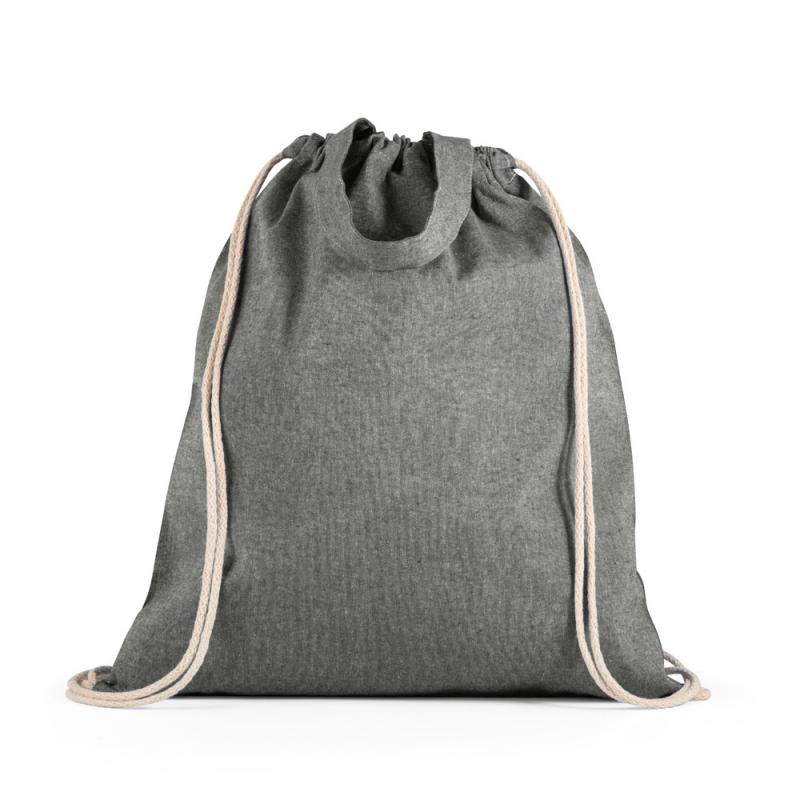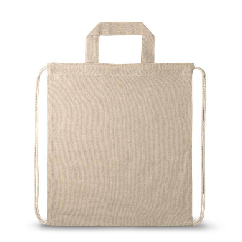 Mochila con algodón reciclado (140 g/m²), asas con 30 cm y cordones con algodón para el cierre.370 x 410 mm