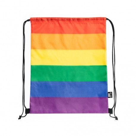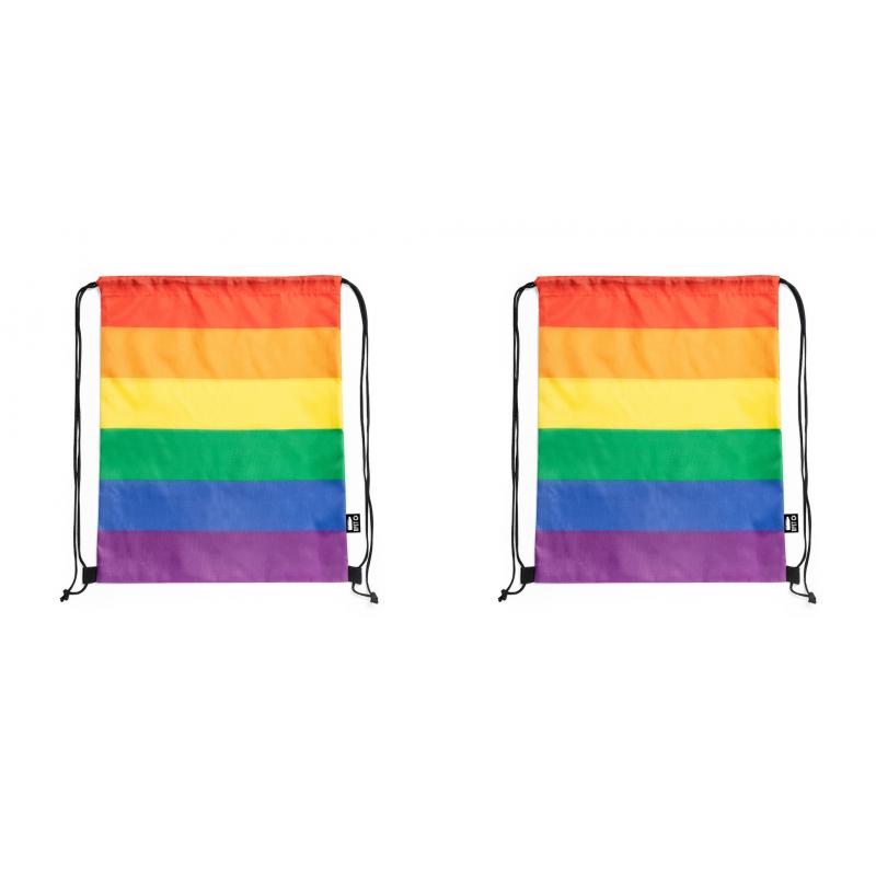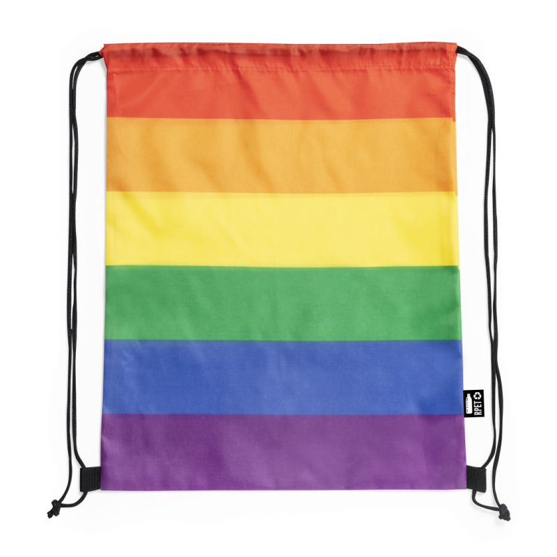 Mochila de cuerdas Rainbow multicolor, fabricada en RPET 210T. De acabado cosido y con cordones de cierre premium en negro. Todo un orgullo de mochila, con distintivo RPET en etiqueta exterior.El material RPET se elabora a partir de plástico reciclado, para así fomentar la reutilización de residuos plásticos y ayudar a la sostenibilidad del planeta.