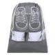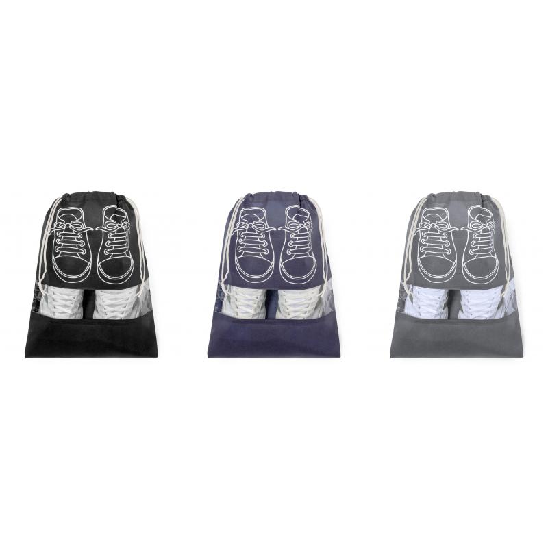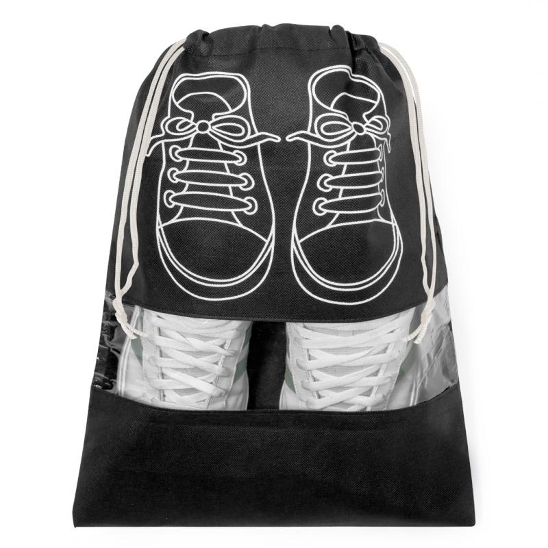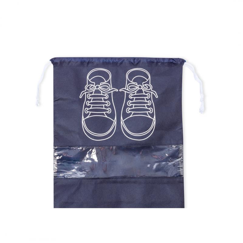 Bolsa portazapatos fabricada en non-woven. Práctica para guardar calzado, con serigrafía inspirada en zapatillas de cordones y práctica ventana transparente para visualizar el interior, con cierre de cordón. Disponible en variados colores diferentes y detalles en blanco.