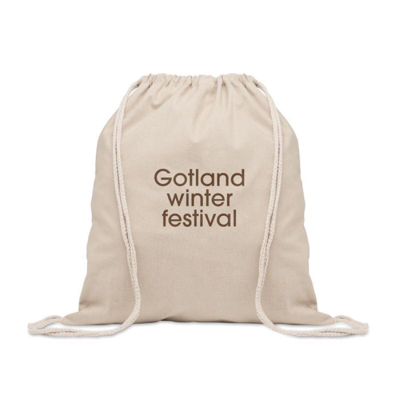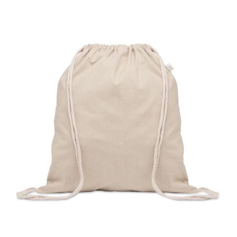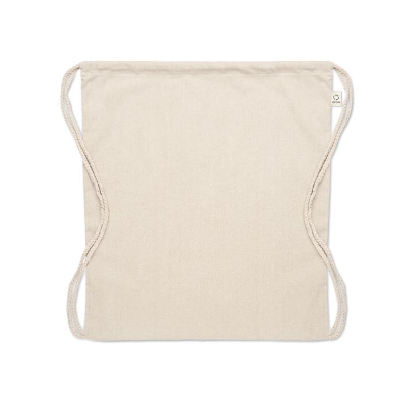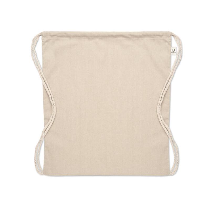 Bolsa de cuerdas de algodón reciclado pre consumo (70%) y RPET (30%). 140 gr/m².Recipiente :