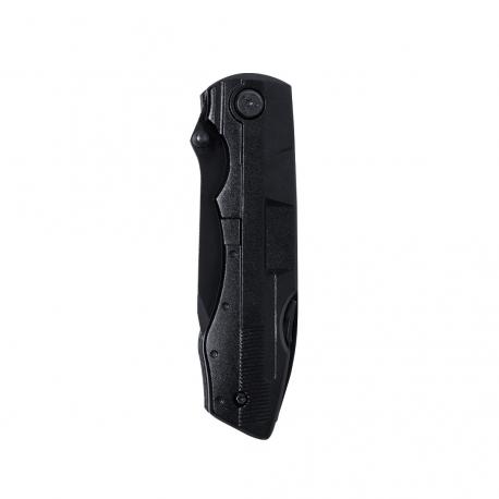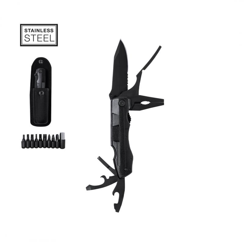 Navaja multiusos de acabado negro en acero inoxidable y resistente empuñadura a juego en aluminio. De diseño plegable y tamaño compacto. Incluye 10 funciones: - Destornillador con múltibles cabezales- Cuchillo de filo liso y dentado-Abrebotellas- Abrelatas- Alicates con cortador de hilosPresentada en práctico estuche de poliéster a juego con accesorio para cinturón.