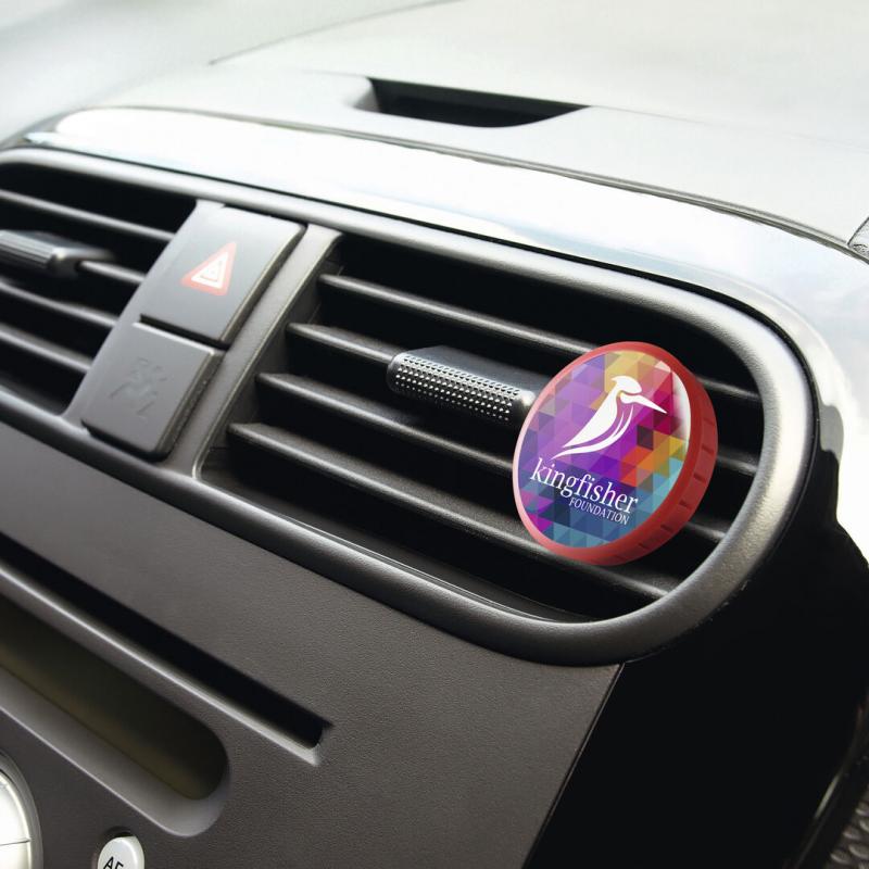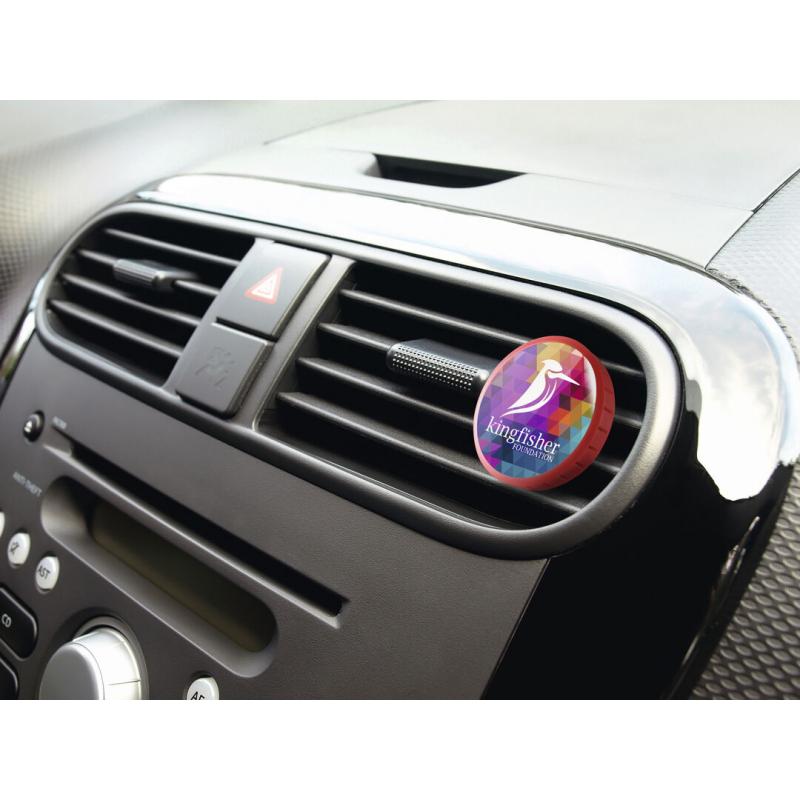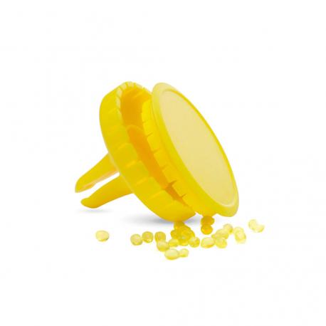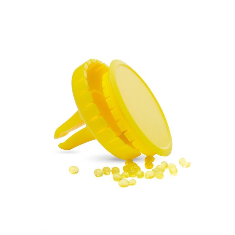Ambientador aroma limón para rejilla de automóvil. Con cuerpo acabado en divertidos colores y troquelado especial para marcaje en doming/gota de resina.