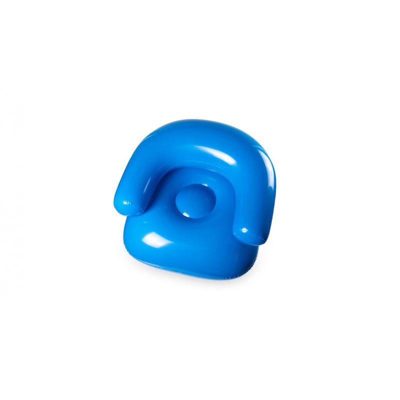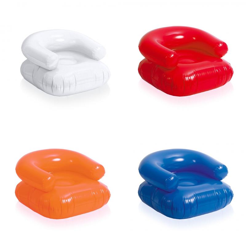 Sillón inflable en PVC de confortable respaldo y con asiento reforzado en vivos colores. Presentado con plegado especial para fácil impresión.