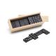 Juego de dominó en caja de madera con tapa. Piezas en negro con relieve y detalles en blancoRecipiente :