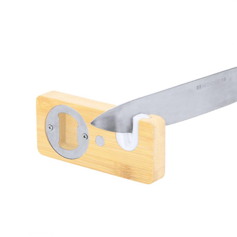 Práctico abridor y afilador 2 en 1, fabricado en bambú. Incluye afilador de cuchillos integrado, abridor de botellas e imán.