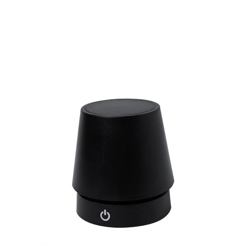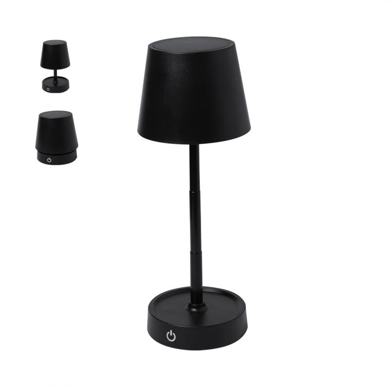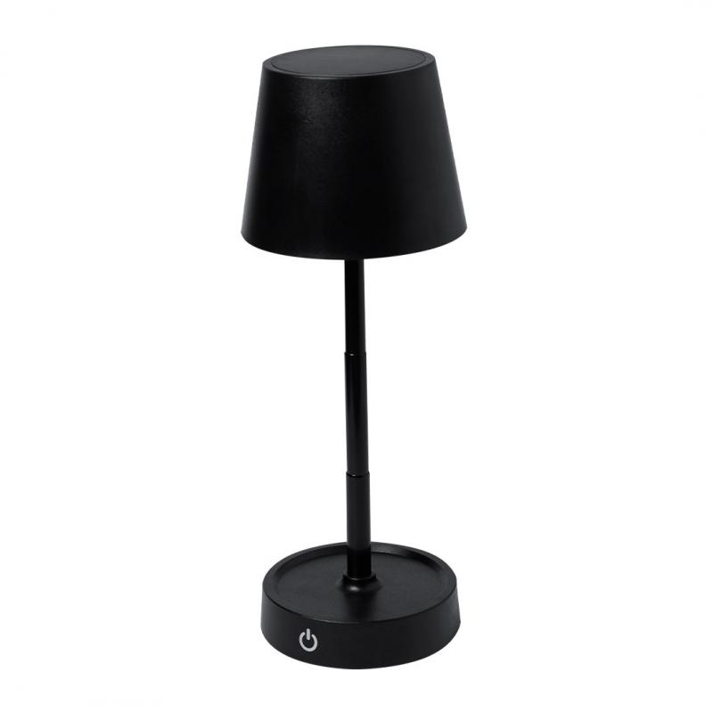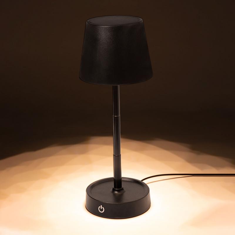 Lámpara de diseño en acabado negro mate. Incluye sistema de regulación de intensidad de luz táctil y con cuerpo plegable para ajustarlo en altura. Equipada con batería de 800mAh recargable por USB Tipo C -cable incluido- y 12 LEDs de luz cálida. Con botón encendido/apagado en la parte trasera.