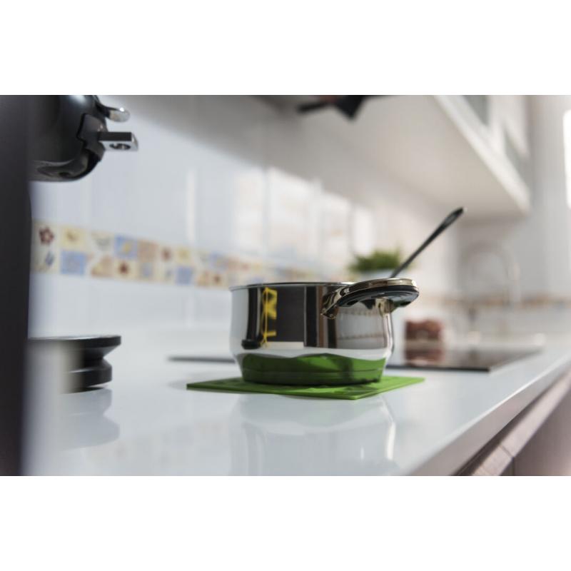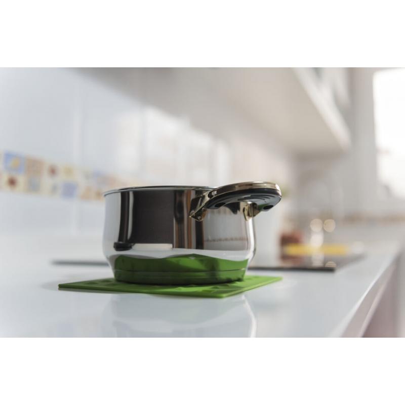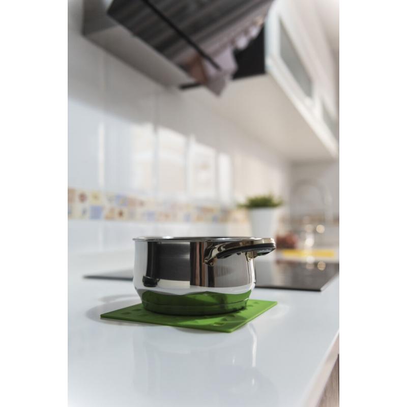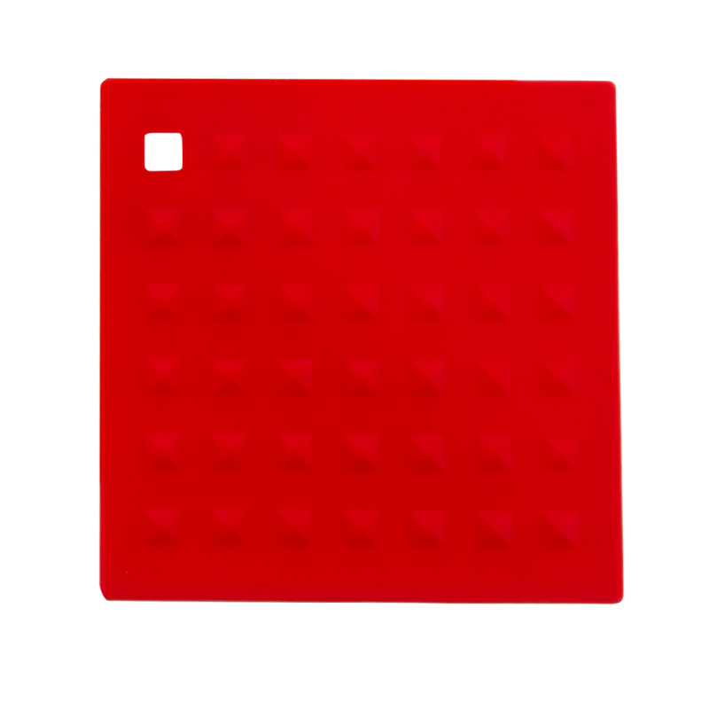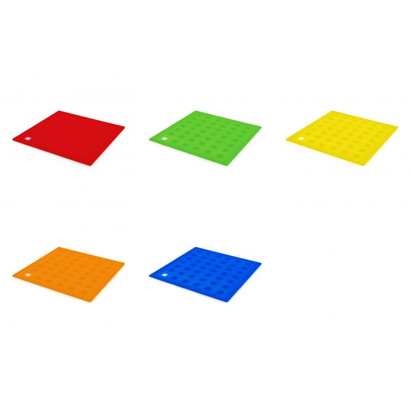 Salvamantel en flexible silicona de vivos colores con superficie reforzada antideslizante y troquelado para colgar.