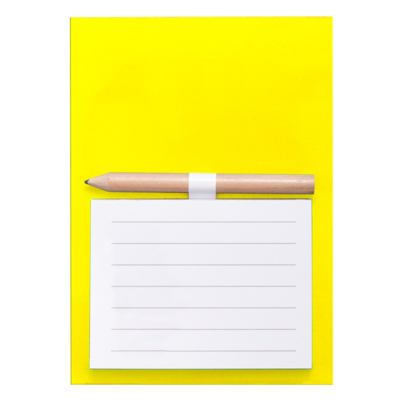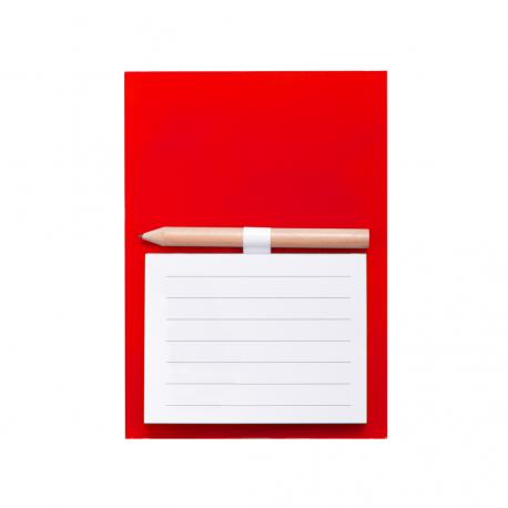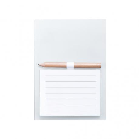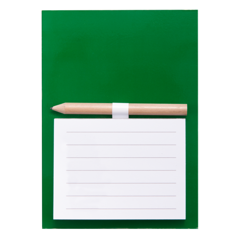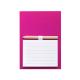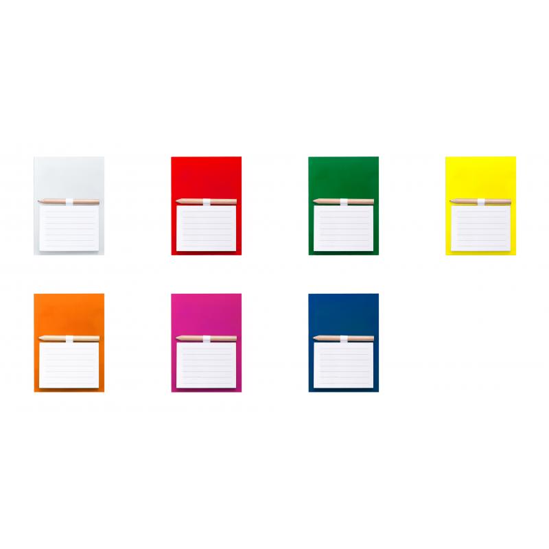 Imán bloc de notas en resistente cartón de vivos y variados colores. Bloc de 40 hojas de distribución a una raya con soporte para minilápiz -incluido-.
