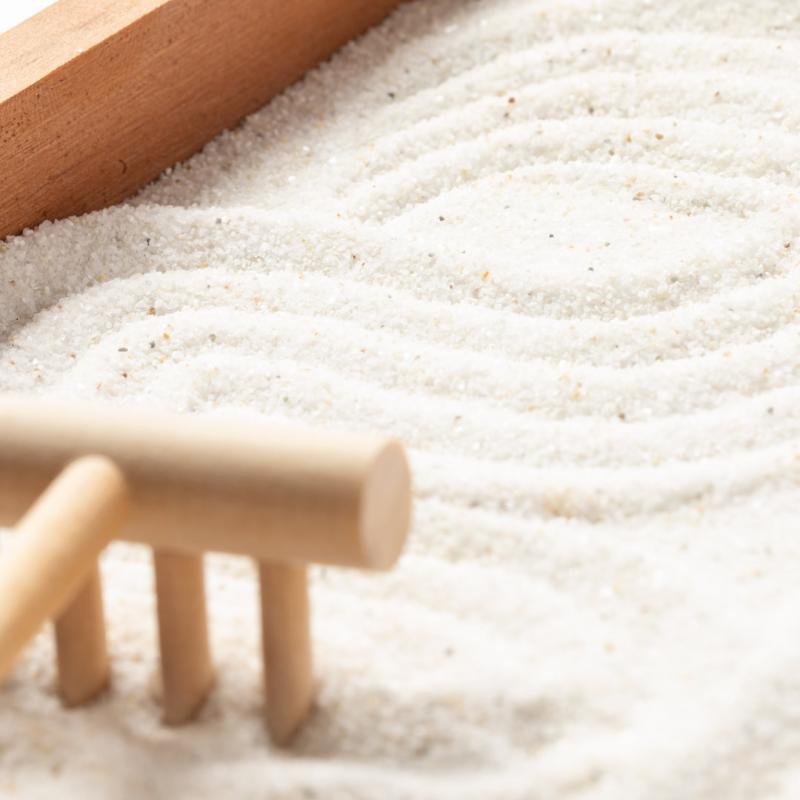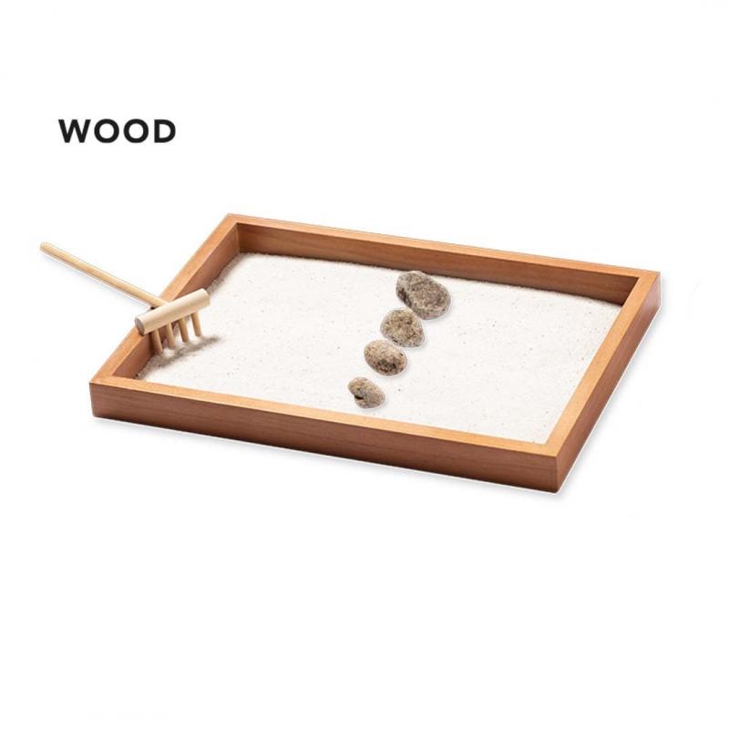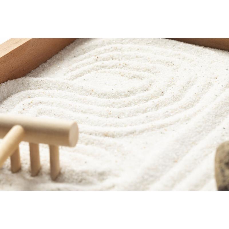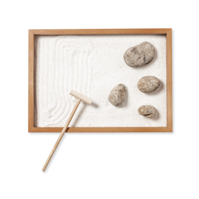 Mini jardín Zen para la relajación y paz interior. Base contenedora y rastrillo fabricados en madera natural, con 4 piedras naturales y saquito de arena blanca. Presentación en caja individual de diseño kraft.