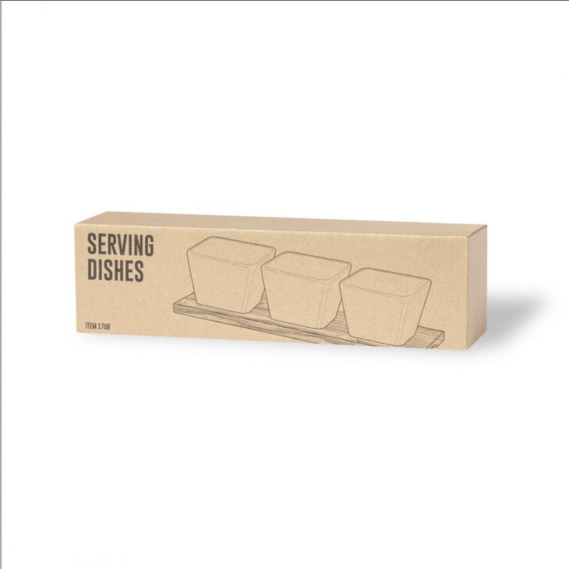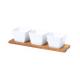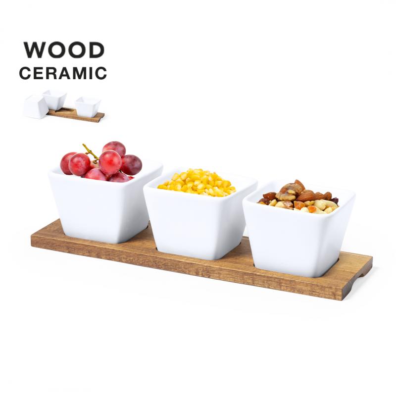 Bandeja de entremeses con 3 cuencos en blanco y fabricados en cerámica. Incluye base en madera natural, troquelada para encajar los cuencos. Presentación en caja individual de diseño kraft.