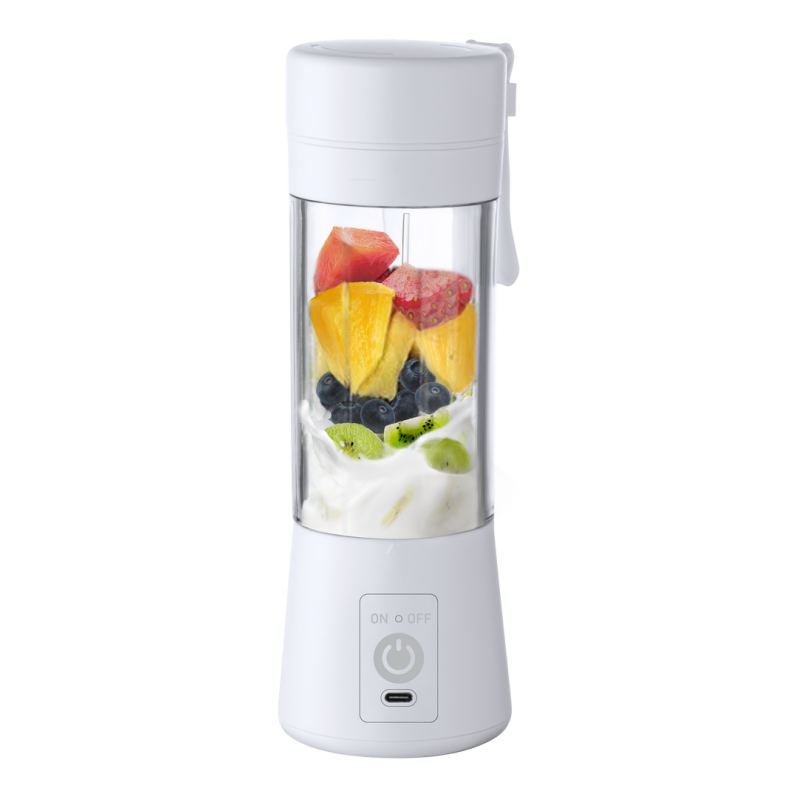 Licuadora fabricada en resistente material ABS de acabado blanco. De 380ml de capacidad y 150W de potencia, con limpiador y pinza incluidos. Batería de 2.000 mAh de capacidad, con conexión Tipo C (cable incluido). Presentada en caja individual de diseño kraft, con manual de instrucciones en español e inglés.