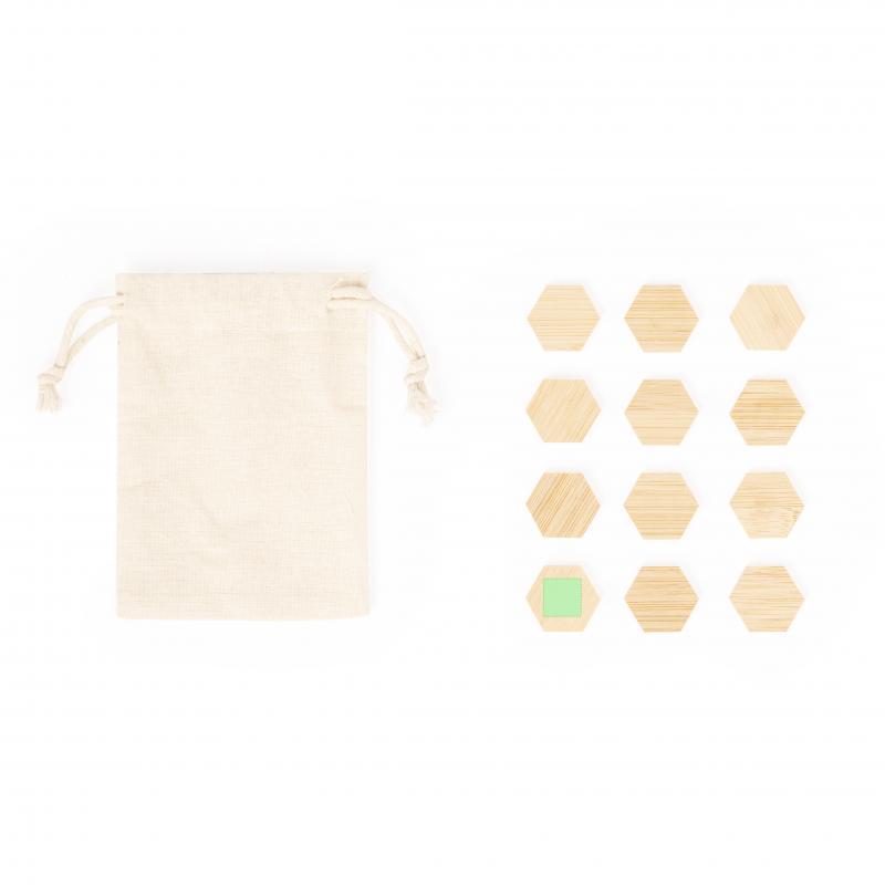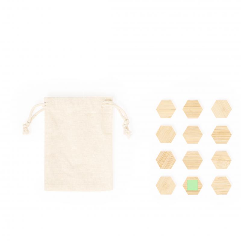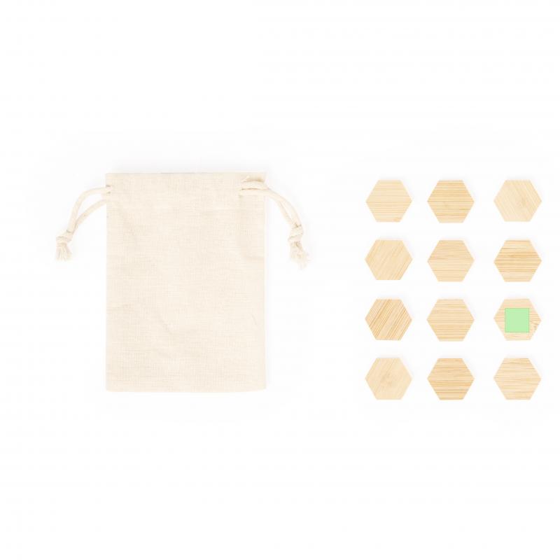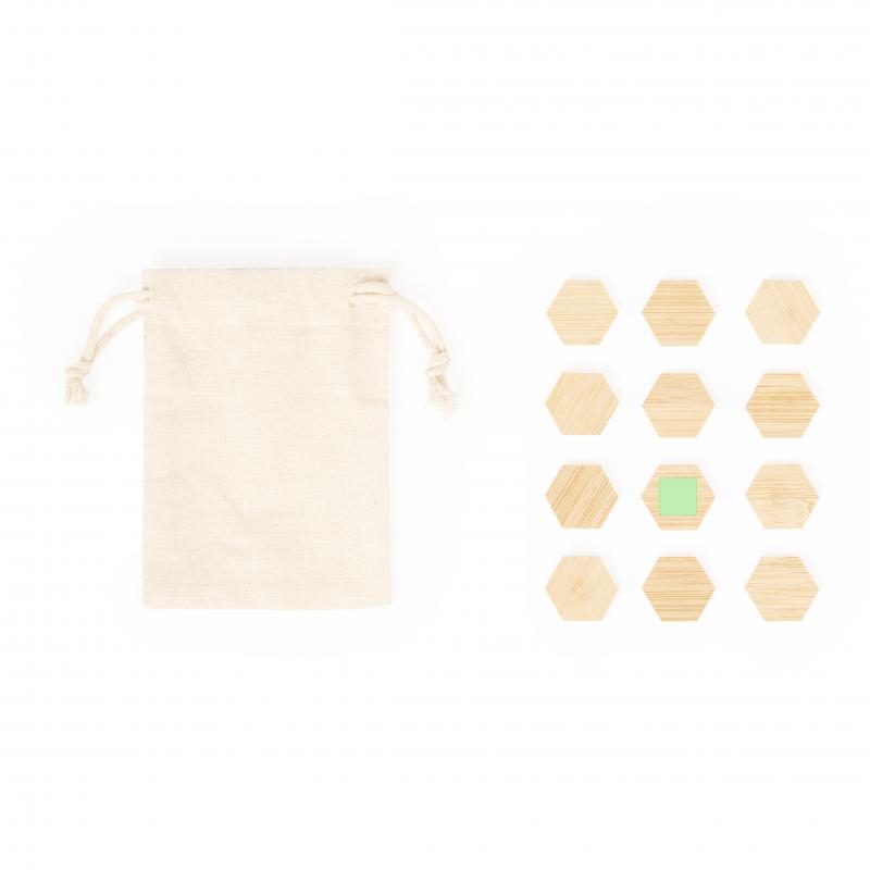 Set de imanes fabricados en bambú. Incluye 12 piezas pentagonales talladas en bambú con imán para poder fijar anotaciones, fotos, etc., en cualquier superficie metálica. Presentados en bolsa de algodón. Materiales como el bambú fomentan la utilización de materias primas naturales, reduciendo las emisiones contaminantes. Proviene de una planta de gran resistencia y versatilidad, con crecimiento y regeneración rápidos, siendo una excelente alternativa al uso de madera tradicional.