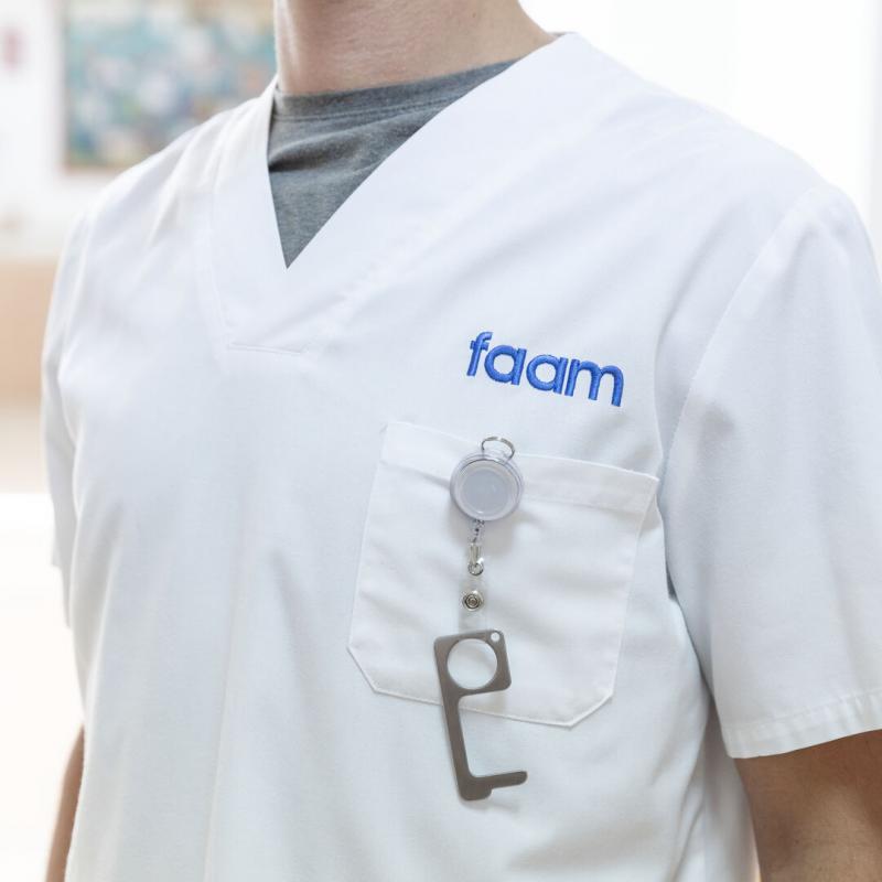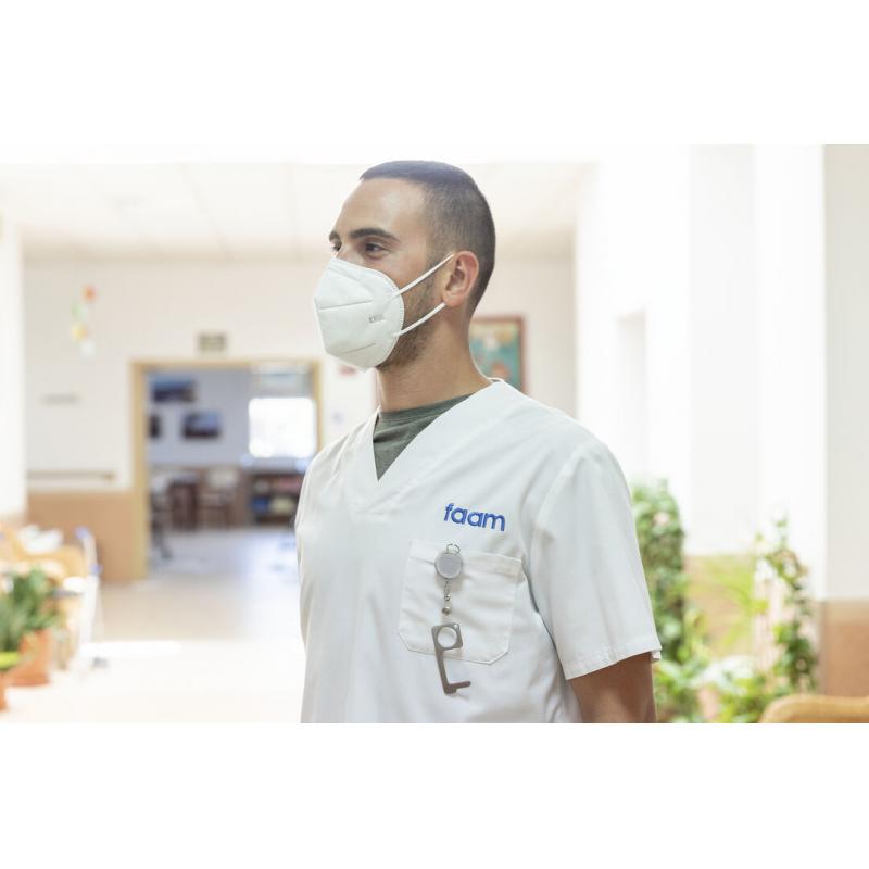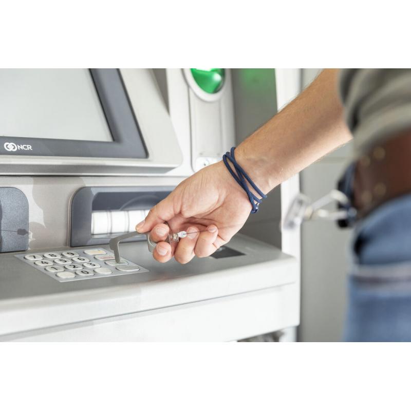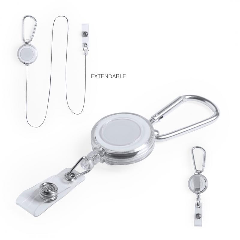Porta objetos extensible de sobrio diseño, con cinta de fijación de cierre de botón y mecanismo extensible de hasta 65 cm. Incluye mosquetón metálico de enganche. Especialmente diseñado para fijar objetos de uso cotidiano y obtener fácil acceso a los mismos (llaveros anticontacto, punteros de seguridad...). Amplia superficie de marcaje en la pieza central.