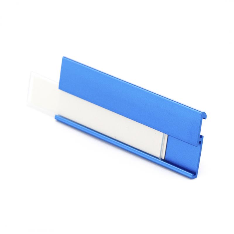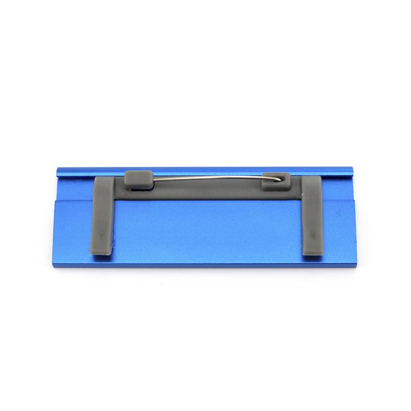 Identificador de aluminio en vivos colores y pinza trasera de enganche para una fijación segura.