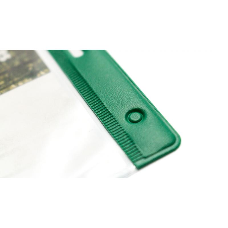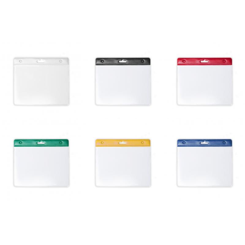 Identificador troquelado en PVC con cabecera en variados colores, ventana frontal transparente y parte trasera transparente.