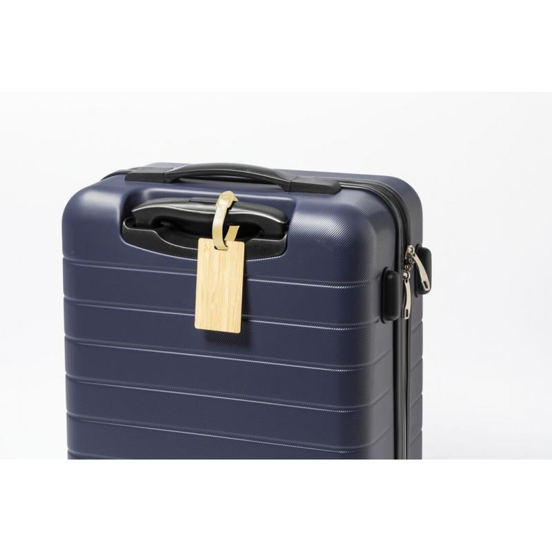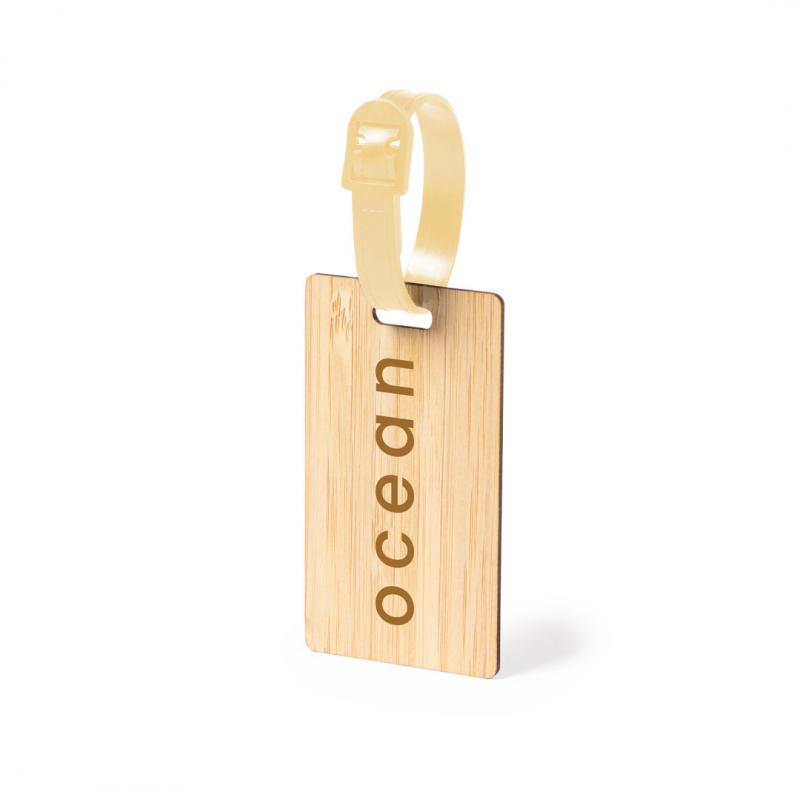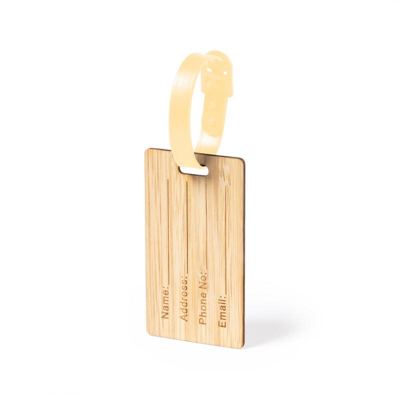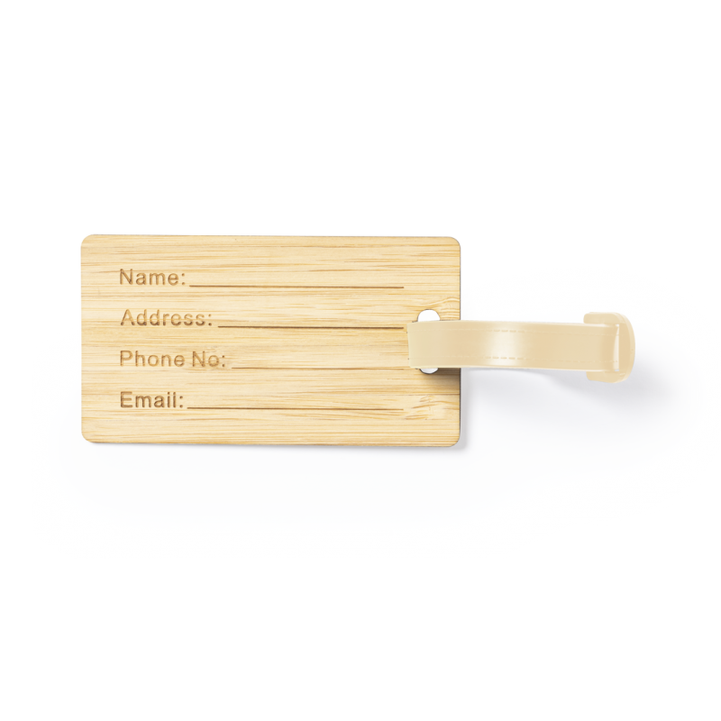 Identificador para maletas de línea nature fabricado en bambú. Cinta de acople con cierre de hebilla y datos de identificación en inglés, con cara opuesta lisa para marcaje.