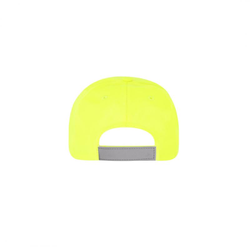 Gorra infantil deportiva en suave poliéster de diseño bicolor en amarillo fluorescente con reflectante perfil en la visera y en cierre. Cierre de velcro y orificios de ventilación bordados.