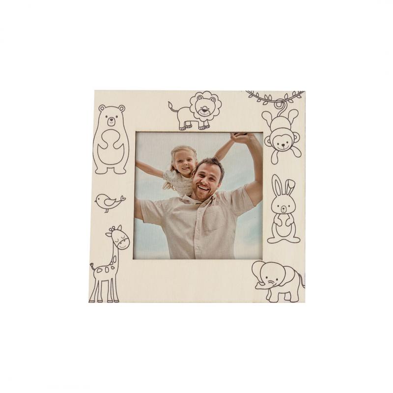 Marco de fotos fabricado en madera natural con diseño de animales. Incluye ceras de colores para personalizar y decorar el marco. Diseñado para fotografías de 7,5x7,5 cm. Cuenta con práctico soporte trasero de bisagra.
