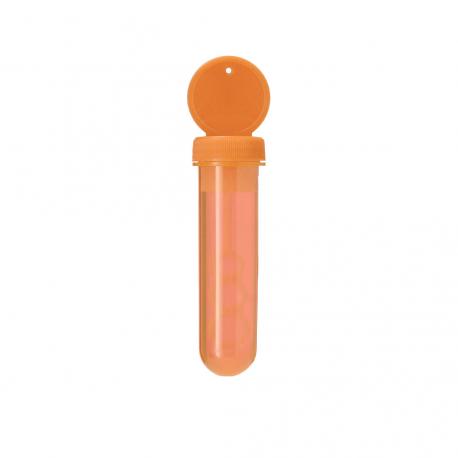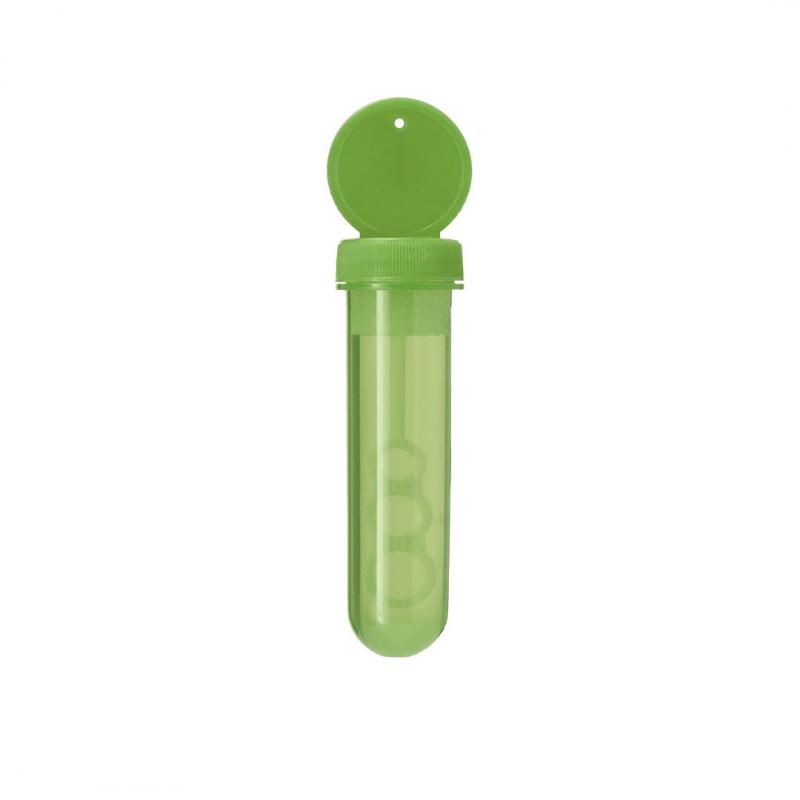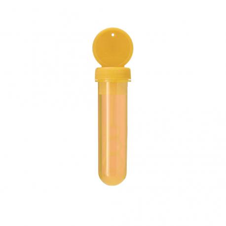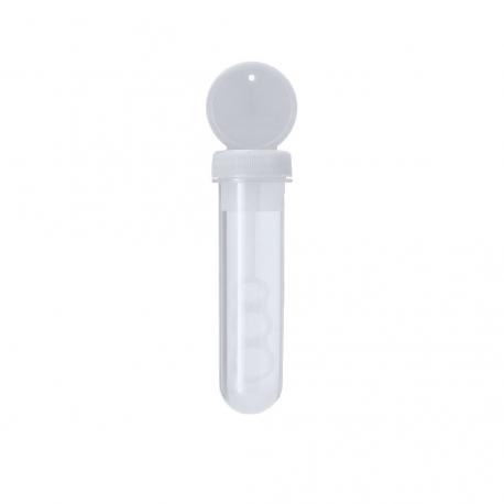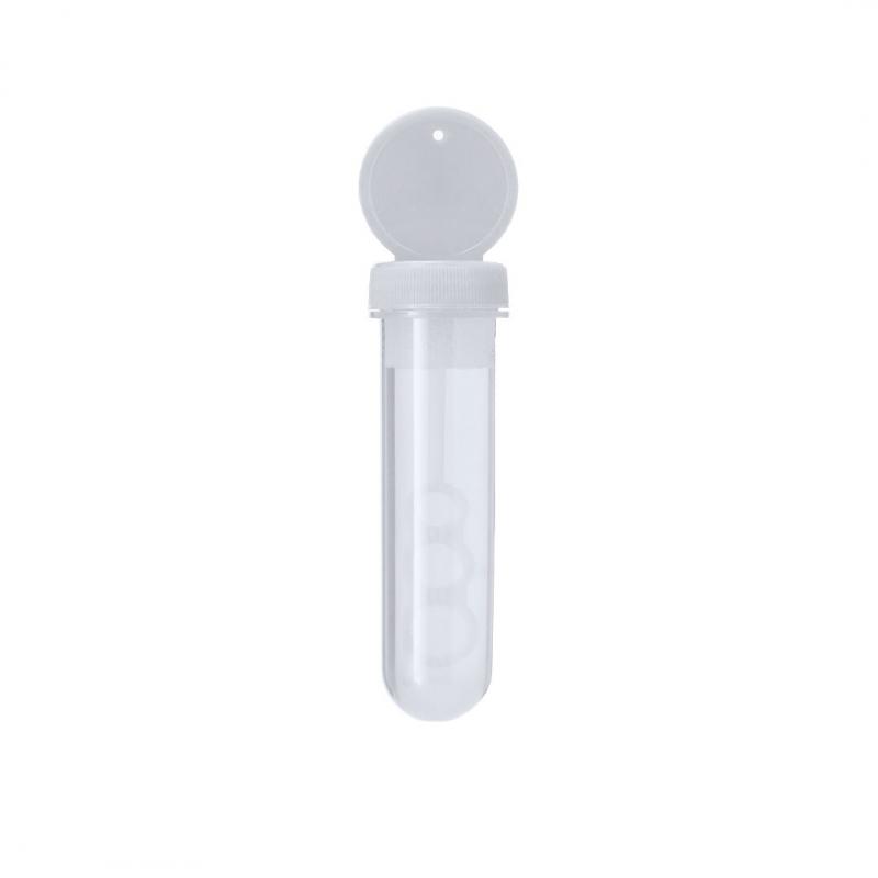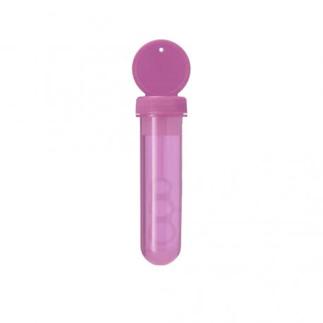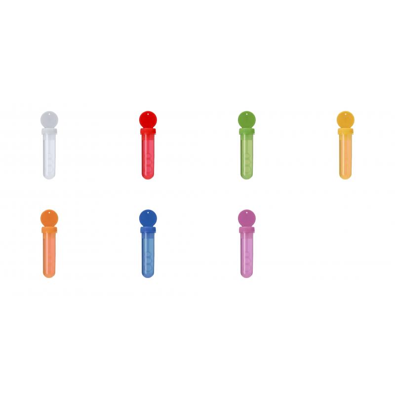 Pompero con aplicador especial que permite crear pompas en 3 tamaños. Líquido incluido (30 ml). Con tapadera de color sólido y cuerpo translúcido.