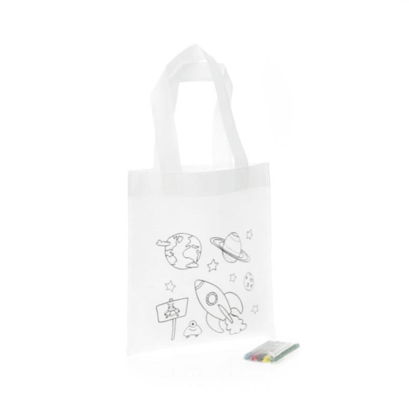 Bolsa de non-woven en color blanco especialmente diseñada para colorear con ceras. Incluye 5 ceras de cuerpo cilíndrico en variados colores. Asas largas de 33cm y acabado termosellado.