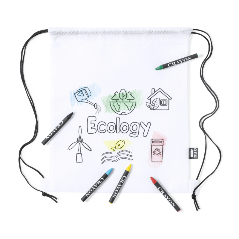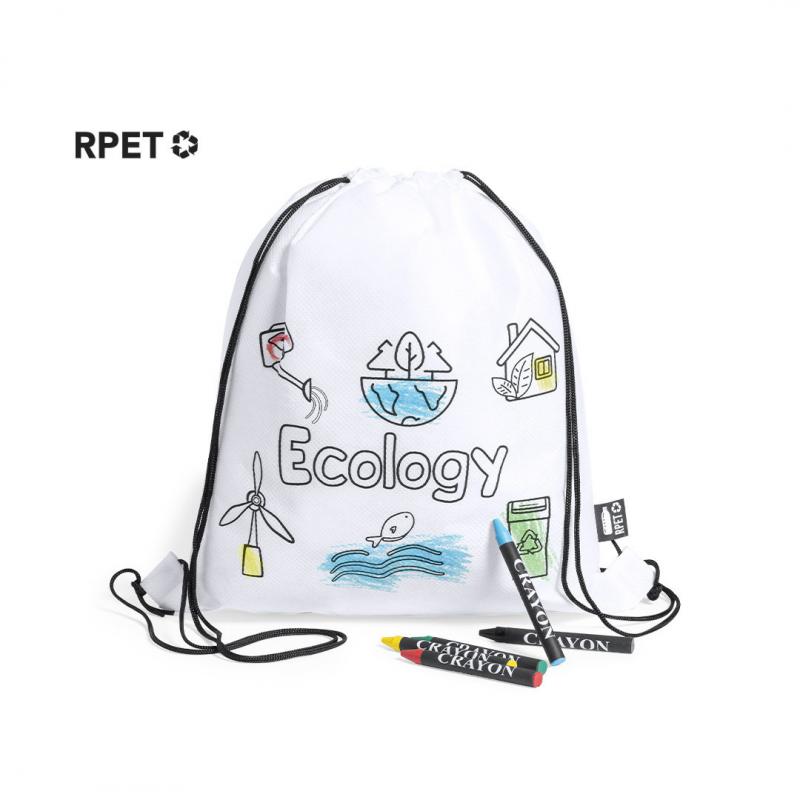 Mochila de cuerdas fabricada en non-woven RPET de color blanco, especialmente diseñada para colorear con ceras. Incluye 5 ceras en variados colores. Con cuerdas de cierre en color negro y refuerzo en las esquinas. Distintivo RPET en etiqueta exterior.El material RPET se elabora a partir de plástico reciclado, para así fomentar la reutilización de residuos plásticos y ayudar a la sostenibilidad del planeta.