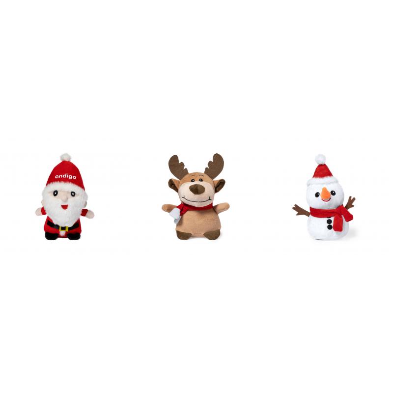 Suaves y adorables peluches con motivos navideños. Disponibles en tres divertidos y originales diseños: Papa Noel, Muñeco de Nieve y Reno. Presentado en bolsa individual reciclada.