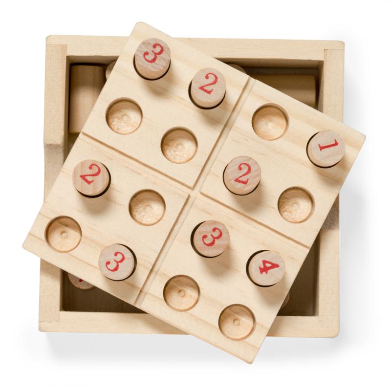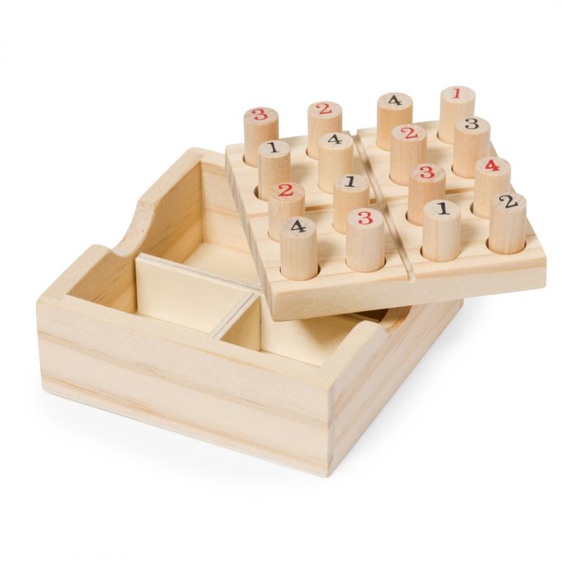 Juego de habilidad sudoku fabricado en suave madera. Incluye 16 fichas de madera numeradas, en estuche de madera con tapa-tablero. Con reglas del juego en español e inglés. Presentado individualmente en caja de diseño kraft.