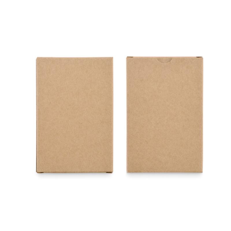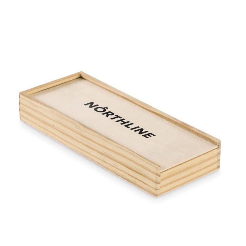Juego de dominó de madera y cartas de papel reciclado. Presentado en caja de MDF.Recipiente :