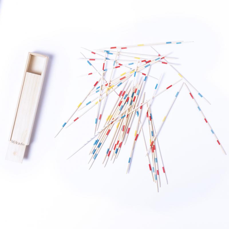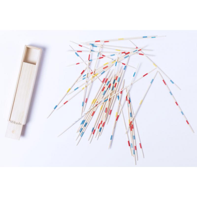 Clásico juego de habilidad mikado con 41 palitos de madera. Presentado en caja de madera con tapadera deslizante.