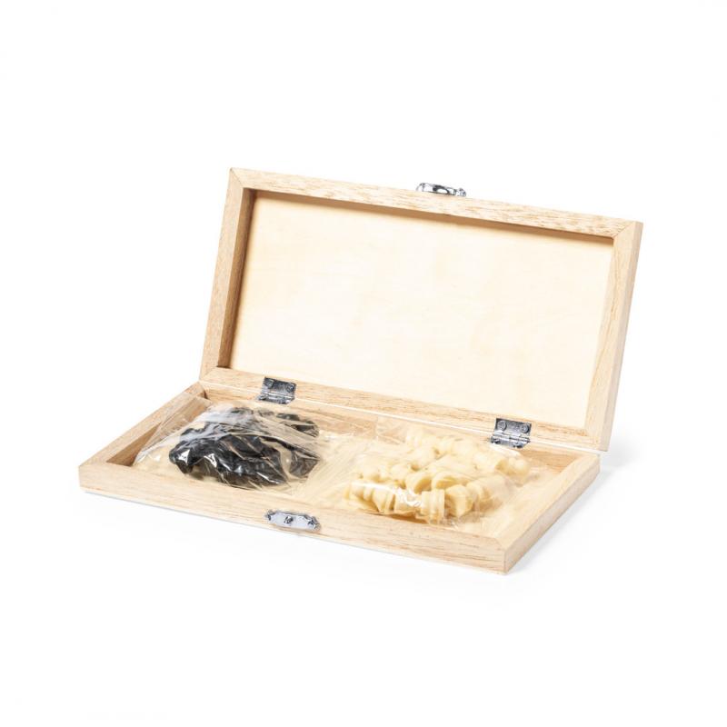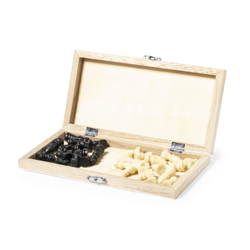 Ajedrez con tablero plegable fabricado en madera natural de pino. Bisagras y cierre metálicos, con compartimento interior para almacenar las piezas. Presentación en caja individual de diseño kraft.