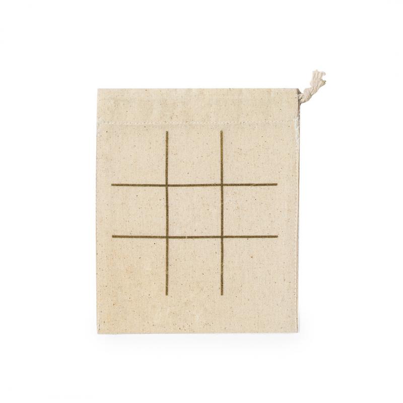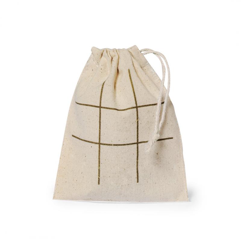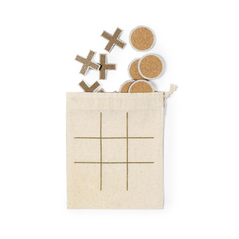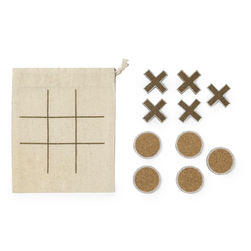 Juego tres en raya fabricado en corcho natural. Incluidas 5 fichas circulares y 5 fichas en cruz. Presentado en bolsa de algodón con cierre de cordón que sirve como tablero para jugar.