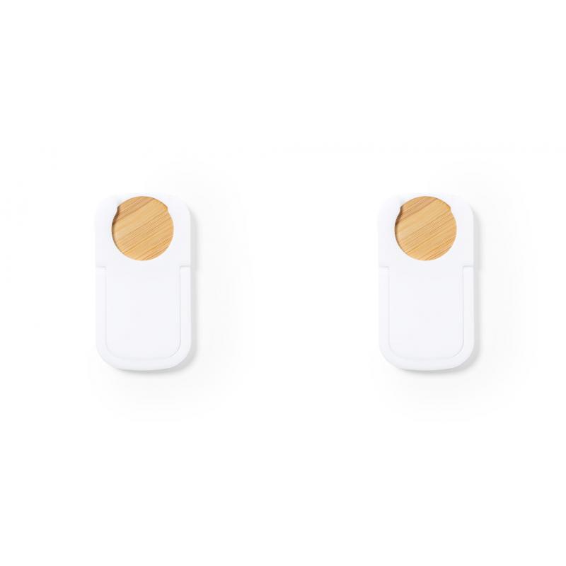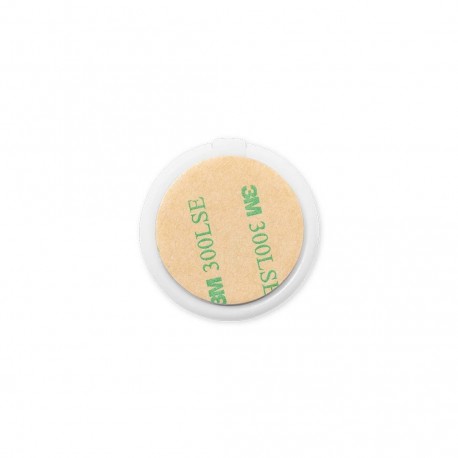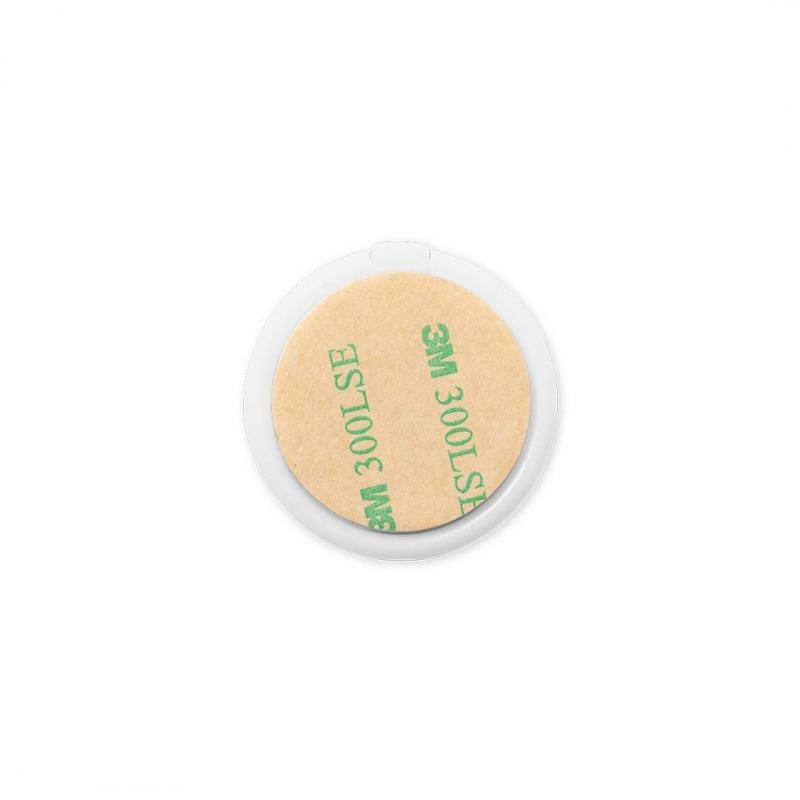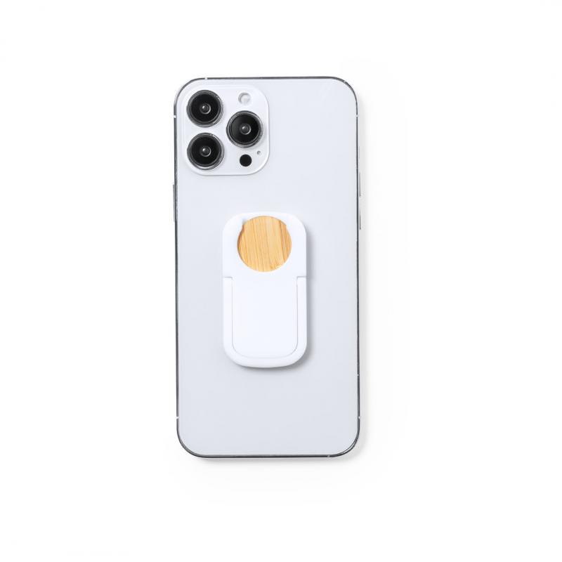 Soporte multifunción para smartphone, con moneda para carro de la compra integrada y anilla/soporte plegable. Cuerpo fabricado en resistente ABS de acabado blanco, con moneda en bambú. Con adhesivo de fijación extra fuerte y libre de residuos al despegarlo del dispositivo.