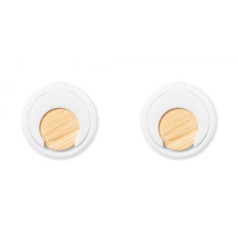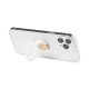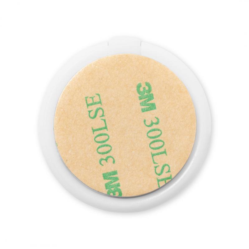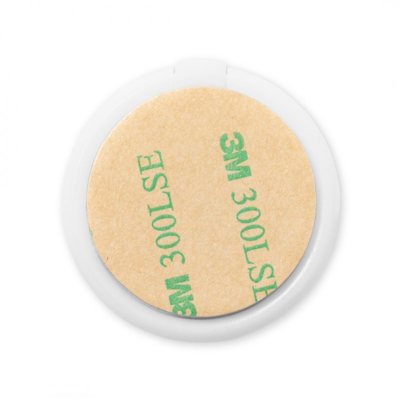 Soporte multifunción para smartphone, con moneda para carro de la compra integrada y anilla/soporte plegable. Cuerpo fabricado en resistente ABS de acabado blanco, con moneda en bambú. Con adhesivo de fijación extra fuerte y libre de residuos al despegarlo del dispositivo.