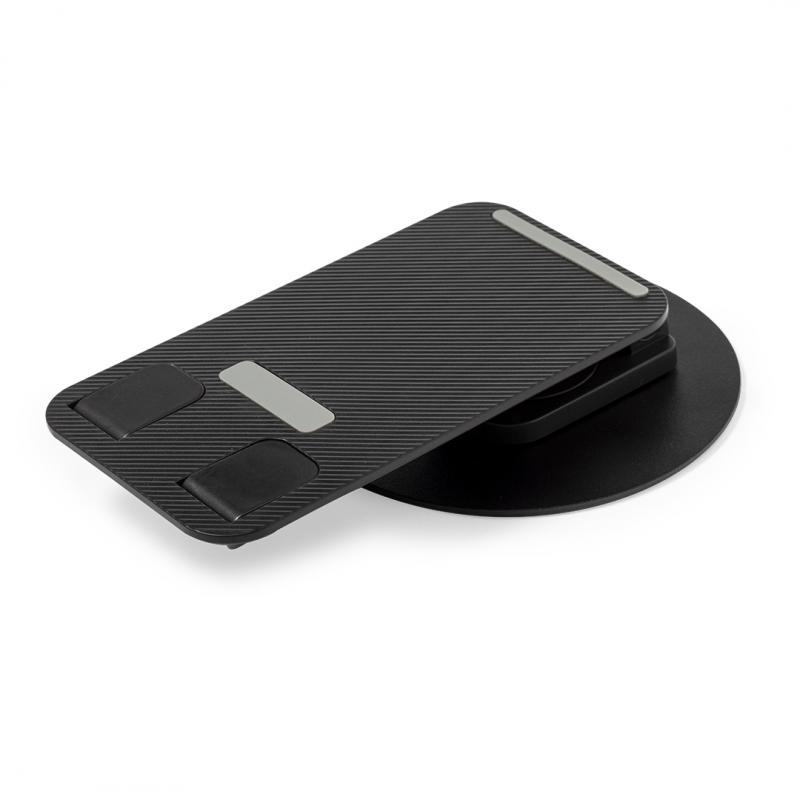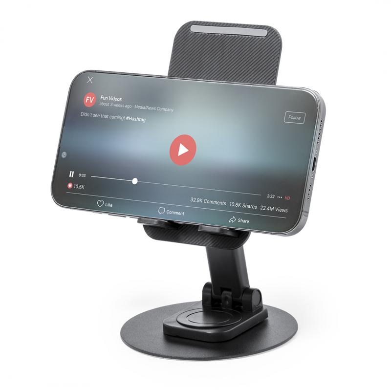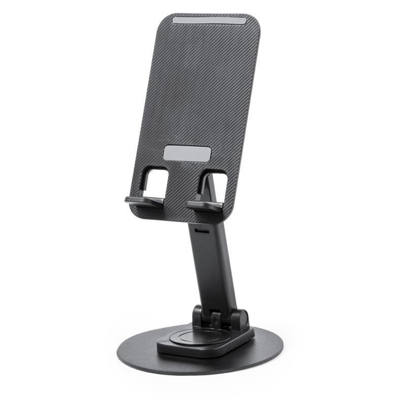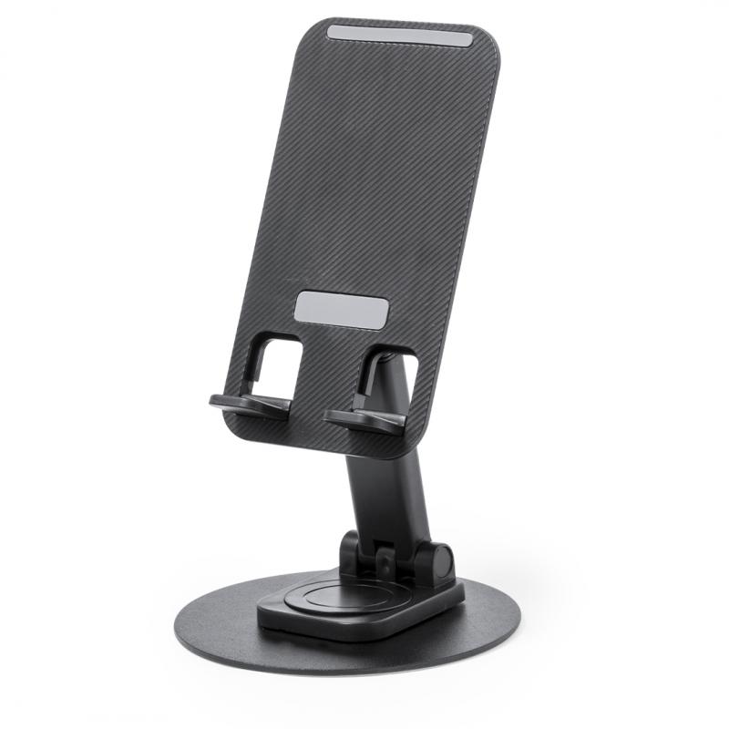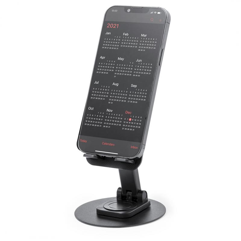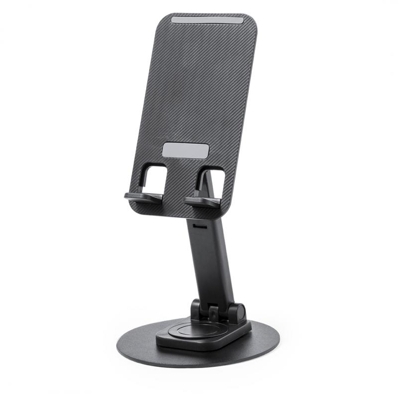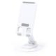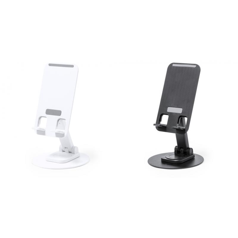 Soporte plegable para smartphone y tablet, fabricado en resistente aluminio y ABS. Regulable en altura, con almohadillas de goma antideslizantes en base y soporte. En sobrio acabado de color blanco o negro, y con amplia superficie de marcaje. Presentado en atractiva caja de diseño.