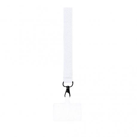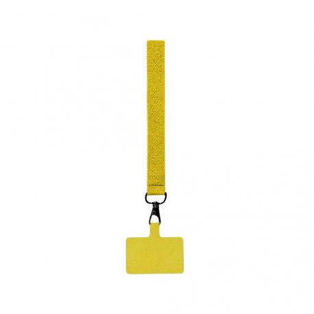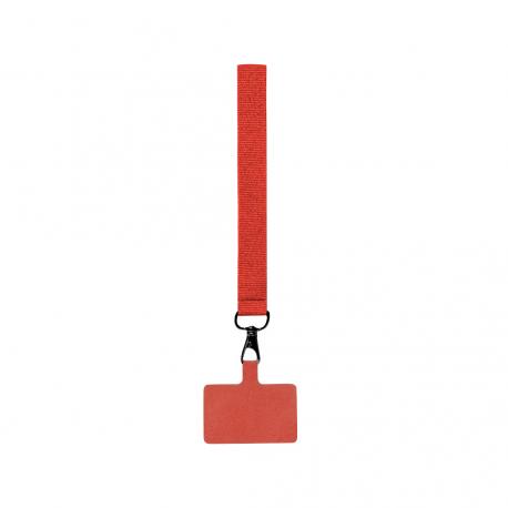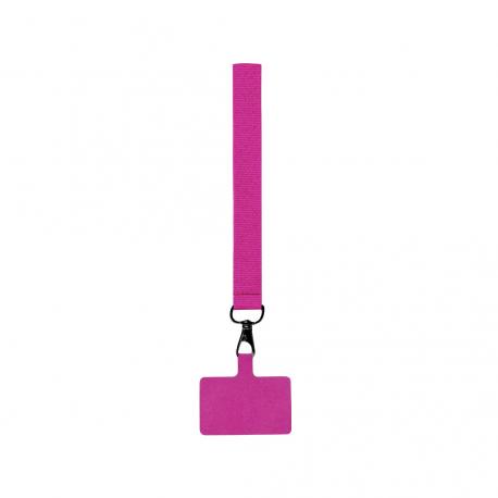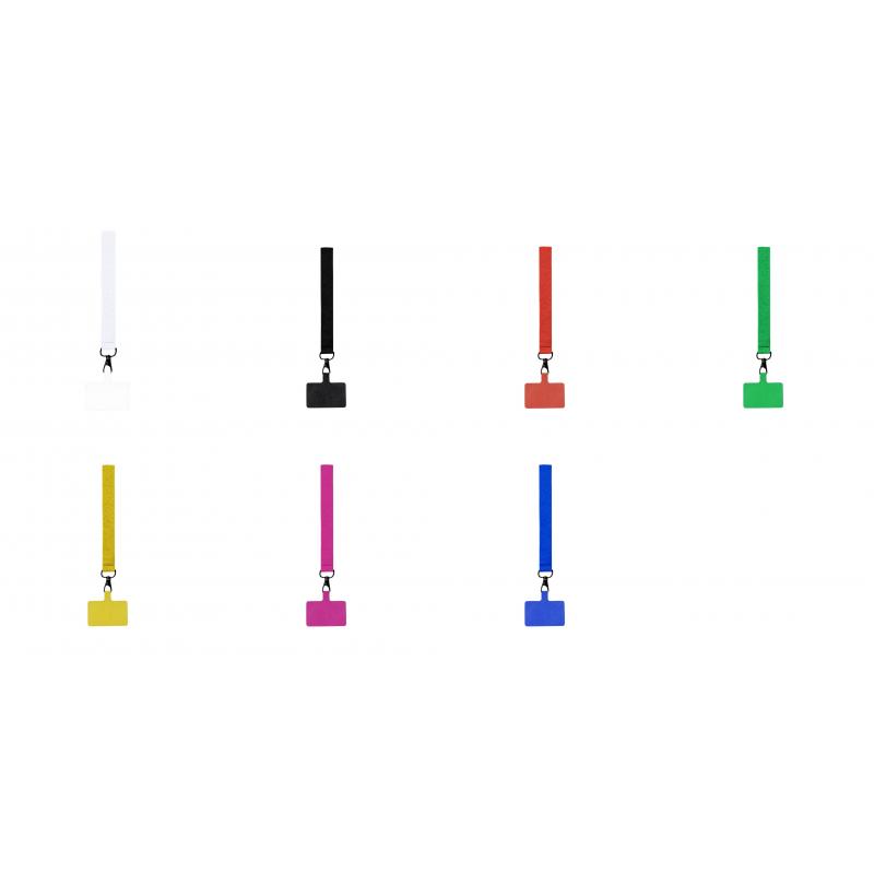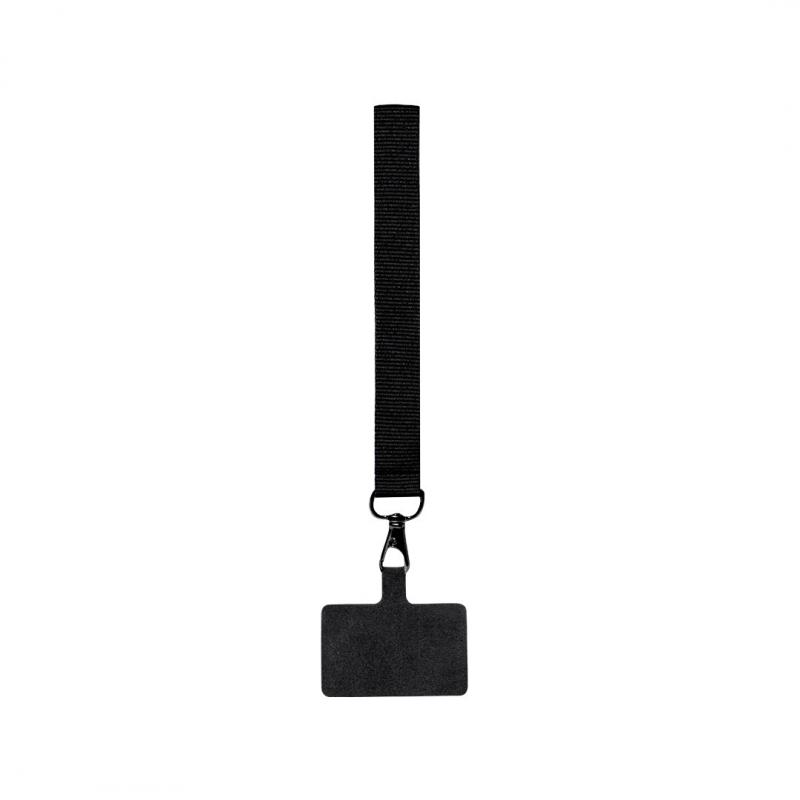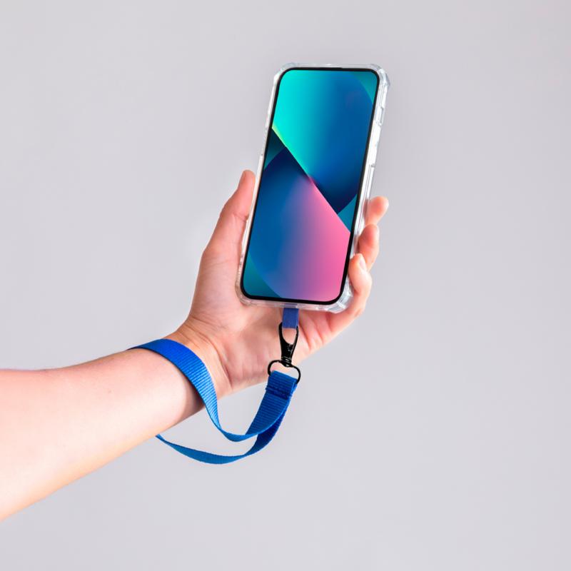 Original pulsera soporte en suave poliéster, adaptable para todo tipo de muñecas y con accesorio de transporte para situar entre la funda y el smartphone. Cinta de transporte a juego y mosquetón metálico giratorio en color negro. Disponible en variada gama de colores.