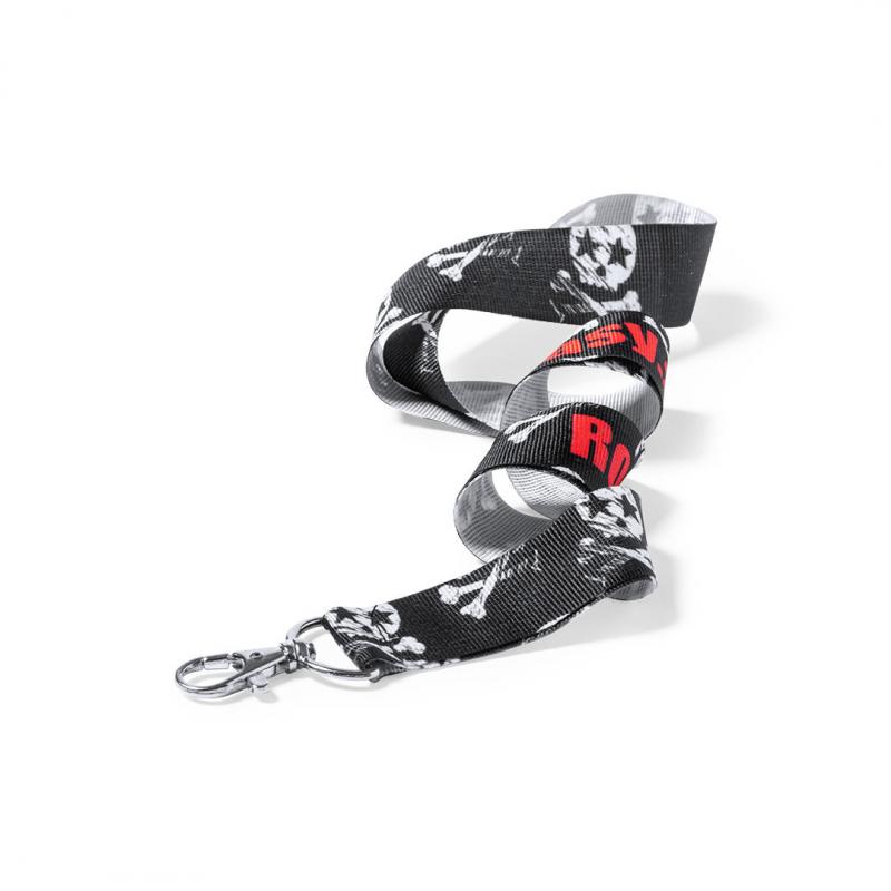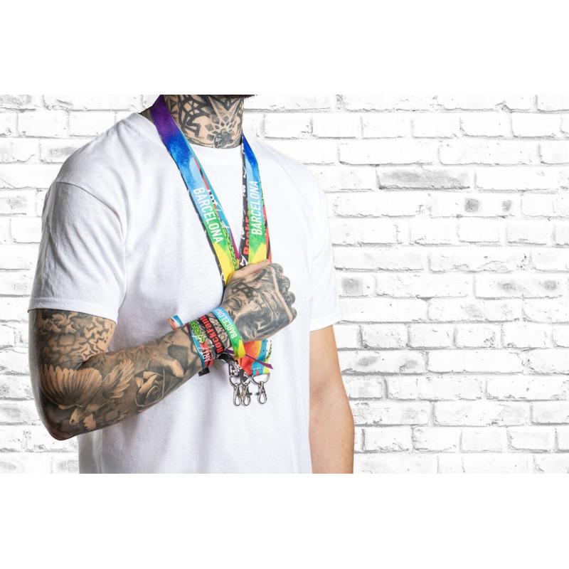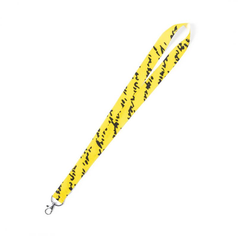 Lanyard con tiras de ancho especial en resistente y suave poliéster con accesorio mosquetón metálico. Especialmente diseñado para personalización total en sublimación para pedidos a partir de 250 piezas.