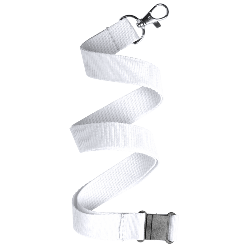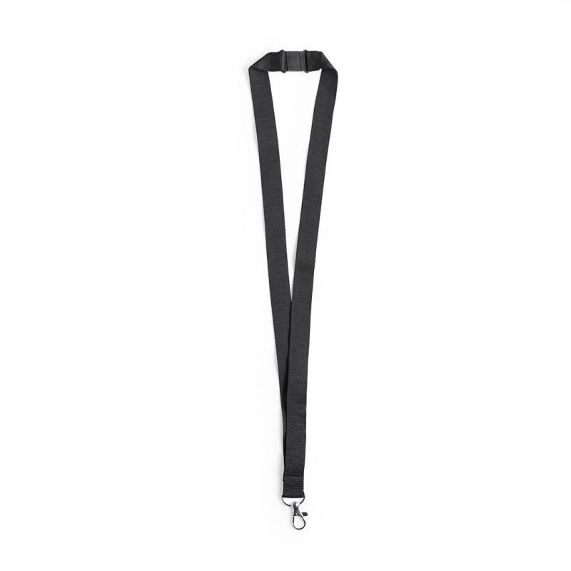 Lanyard en resistente poliéster, con accesorio de seguridad en el cuello y mosquetón metálico. Disponible en variada gama de colores vivos.