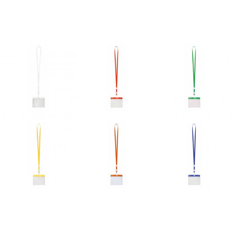 Identificador en PVC con lanyard a juego en vivos colores y con cierre de mosquetón. Pastilla circular para marcaje.