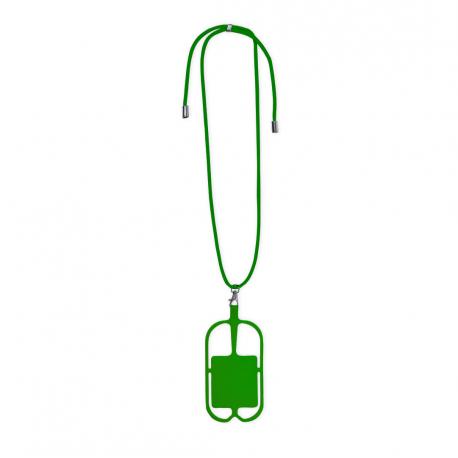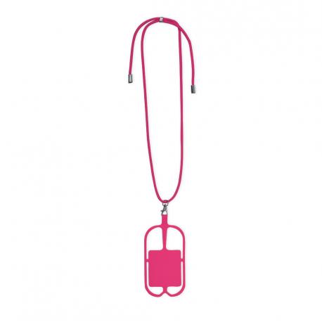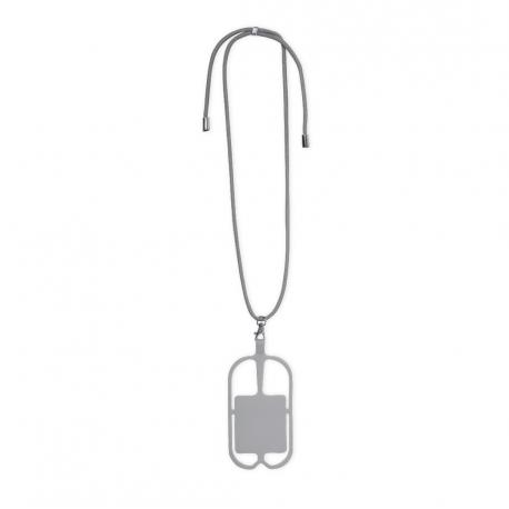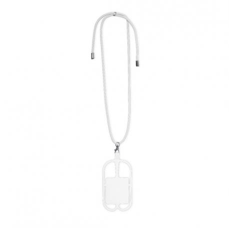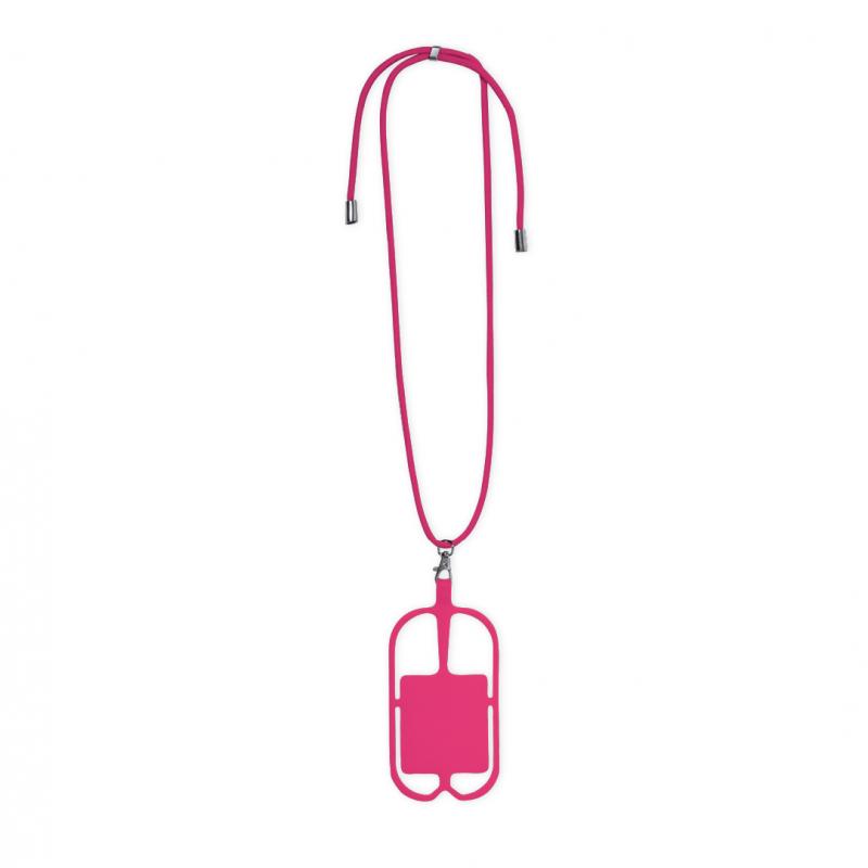Original lanyard portamóvil en resistente poliéster y flexible silicona. Con accesorio de transporte para todo tipo de smartphones, capaz de ajustarse a todas las pantallas. Ajustador en cuello y extremos de cordones en acabado cromado. Incluye amplia zona de marcaje. Disponible en variada gama de colores.