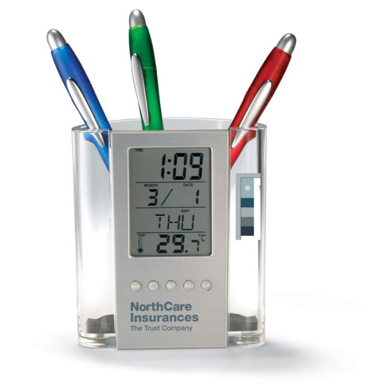Portalápices con calendario, reloj y termómetro. 1 pila botón incluida.