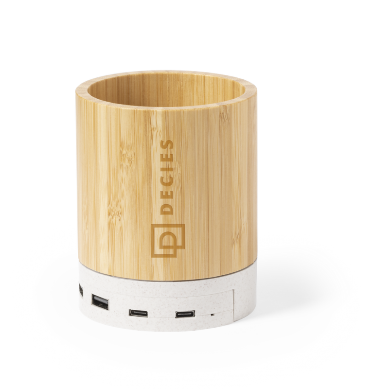 Lapicero multifunción 4 en 1 fabricado en bambú y fibra de trigo.Con funciones lapicero, soporte para smartphones, cargador inalámbrico 5W, puerto USB (2xUSB 2.0 y 1x tipo C) . Compatible con smartphones con tecnología de carga inalámbrica Qi. Incluye cable tipo C en color blanco de 1 metro de largo. Presentado en atractiva caja de diseño kraft. Disponible manual de instrucciones en español e inglés.Elaborado con elementos vegetales para así fomentar la utilización de materias primas naturales y reducir las emisiones contaminantes.