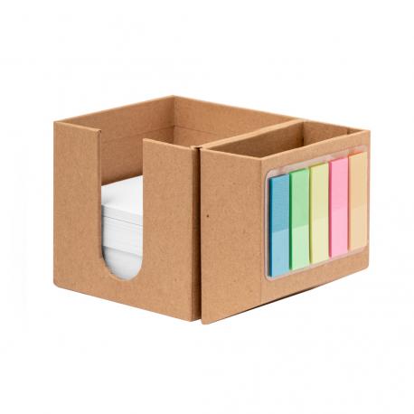 Portanotas fabricado en cartón reciclado. Práctico cubo desplegable con 320 hojas de 7,5x7,5 cm y 125 mininotas adhesivas de 1,5x5cm en variados colores, con práctico hueco para usar como lapicero. El cartón reciclado proviene del reaprovechamiento de excedente de fabricaciones y reciclaje de papel en el final de su vida útil, convirtiéndose en un lienzo ecológico y sostenible.