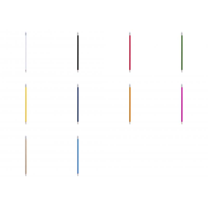 Lápiz de madera de acabado brillo. Con cuerpo redondo y goma de borrar en color blanco. Disponible en variada gama de colores. Mina negra y punta afilada.