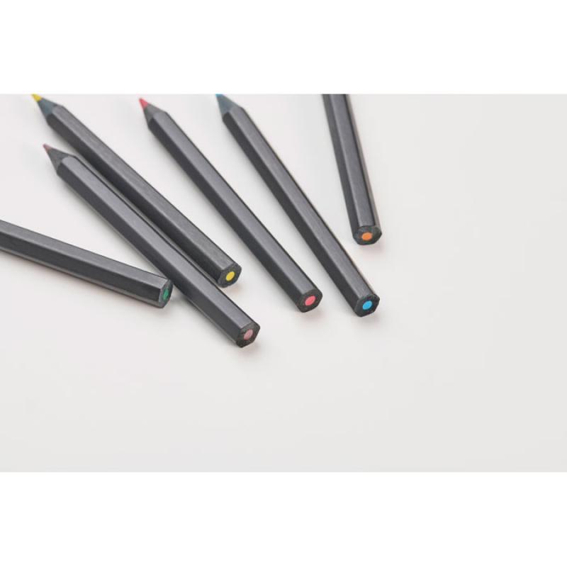 Set de 6 lápices de colores presentados en un tubo de cartón negro con sacapuntas en la tapa.Recipiente :